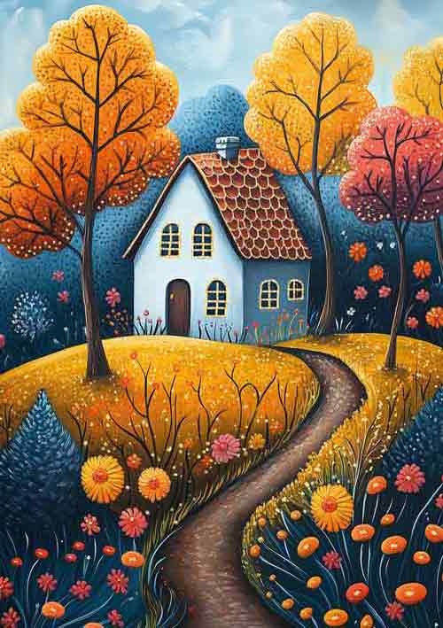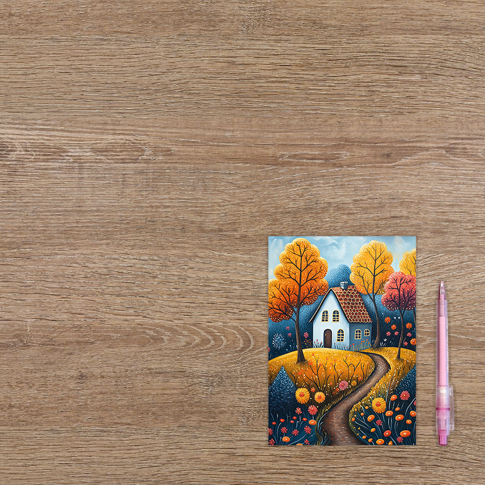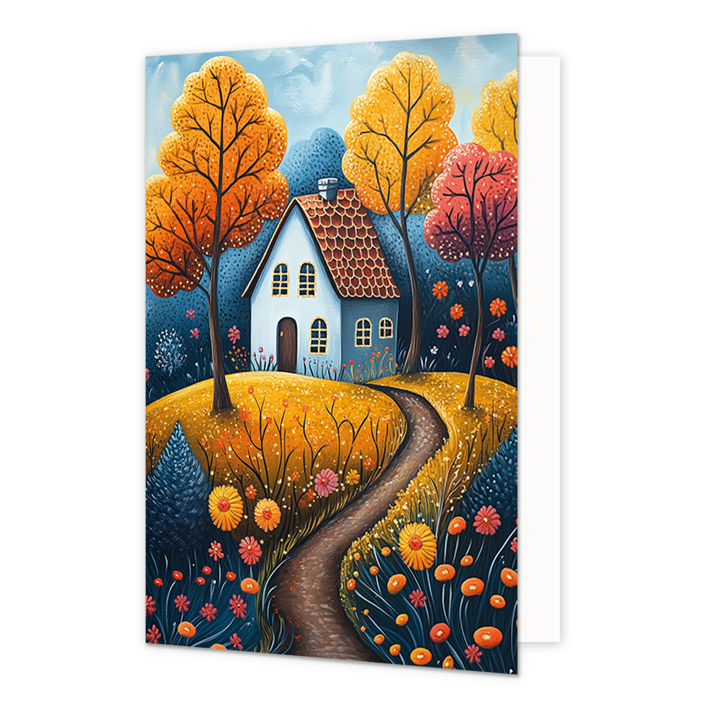 De wenskaart heeft een afmeting van x en een staande vorm. Op deze artistieke wenskaart staat een wit huis midden in een bos met de kleuren oranje, rood en blauw. De binnenzijde van de wenskaart is blanco wat voldoende ruimte geeft om een persoonlijke boodschap te schrijven .