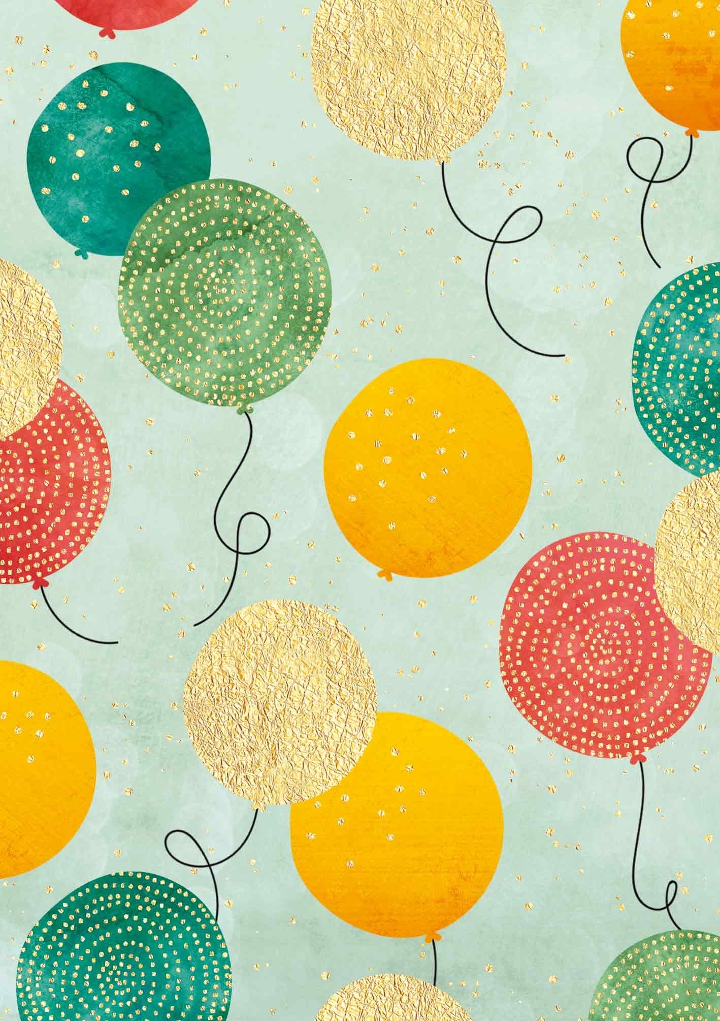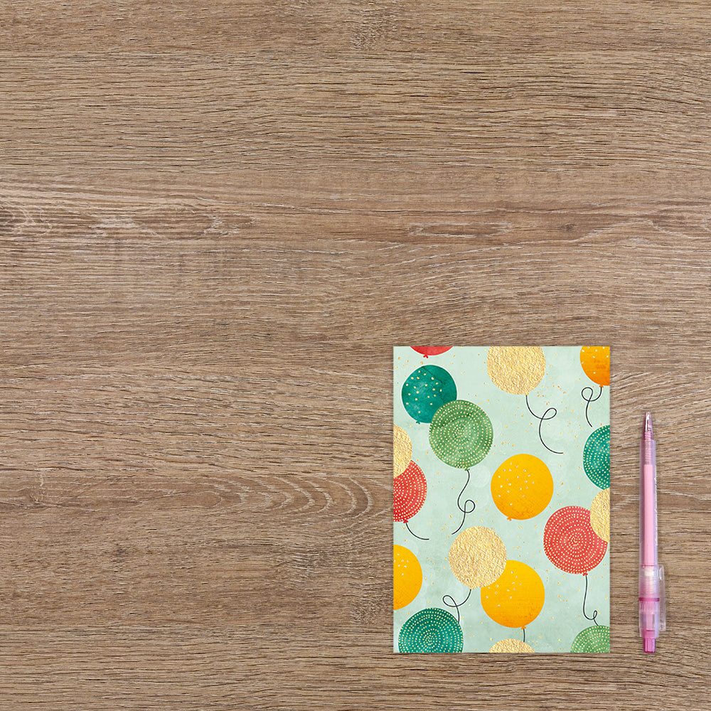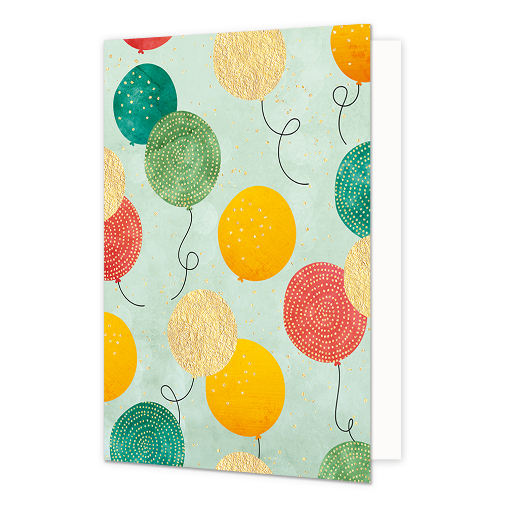 De wenskaart heeft een afmeting van x en een staande vorm. Op deze artistieke wenskaart staan ballonnen in de kleuren goud, oranje, rood en diverse kleuren groen. De binnenzijde van de wenskaart is blanco wat voldoende ruimte geeft om een persoonlijke boodschap te schrijven .