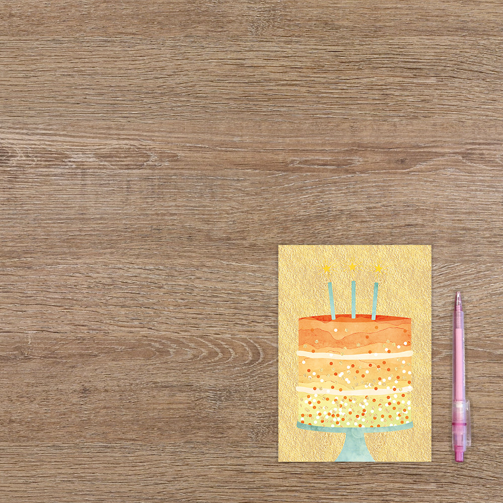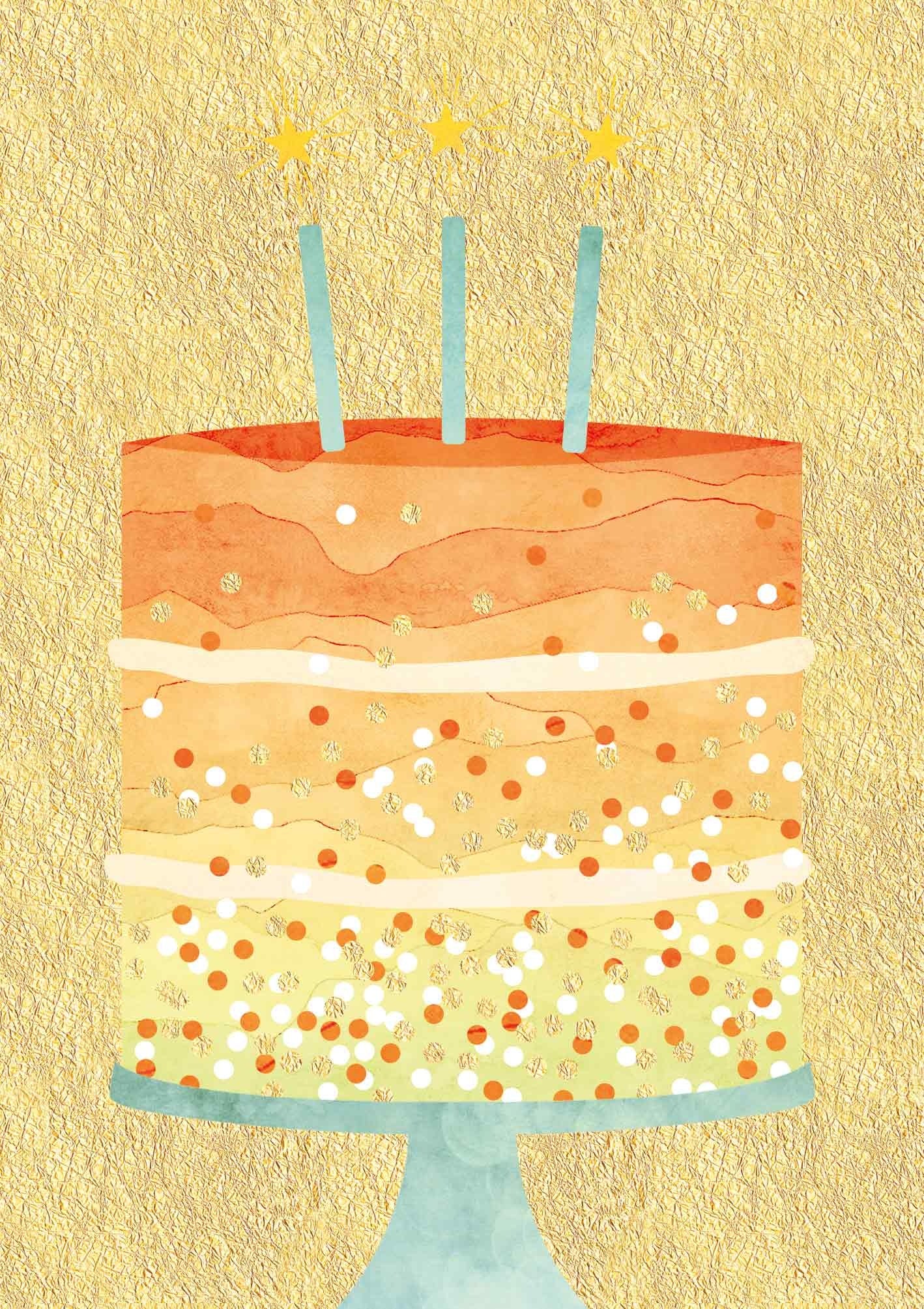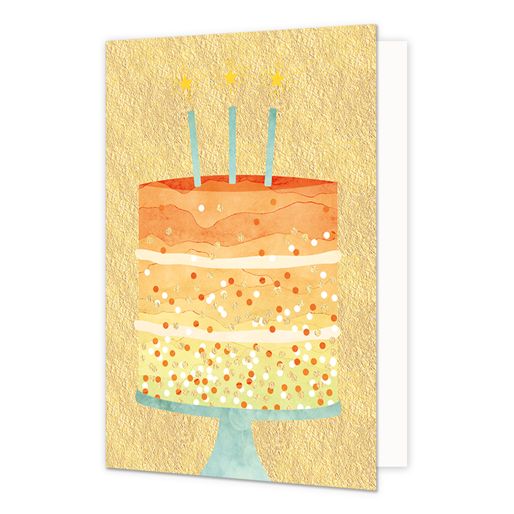 De wenskaart heeft een afmeting van x en een staande vorm. Op deze artistieke wenskaart staat een grote drielaagse taart met kaarsjes, op een gouden achtergrond. De binnenzijde van de wenskaart is blanco wat voldoende ruimte geeft om een persoonlijke boodschap te schrijven .