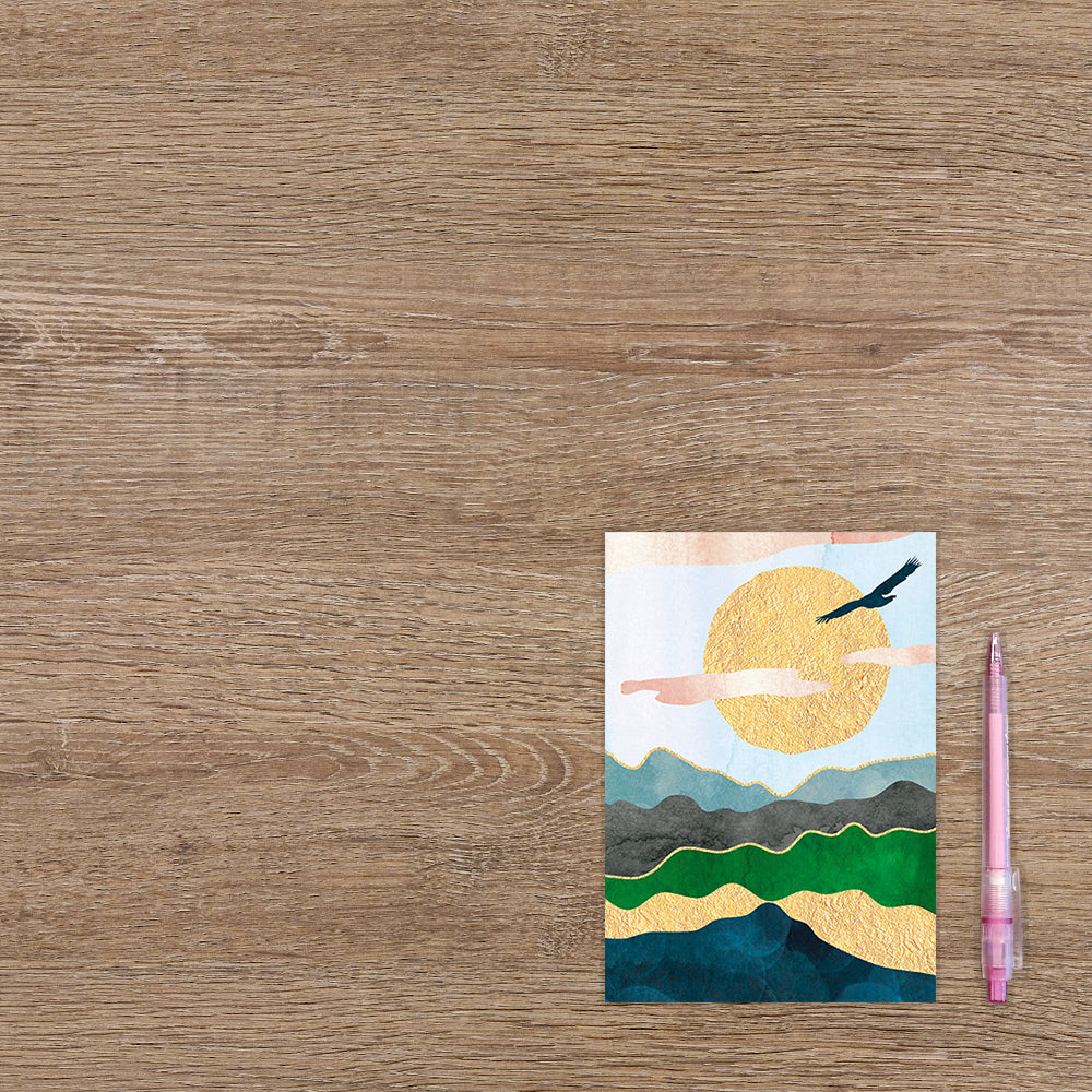 De wenskaart heeft een afmeting van x en een staande vorm. Op deze artistieke wenskaart staat een berglandschap waar een vogel door de lucht vliegt met de zon op de achtergrond. De binnenzijde van de wenskaart is blanco wat voldoende ruimte geeft om een persoonlijke boodschap te schrijven .