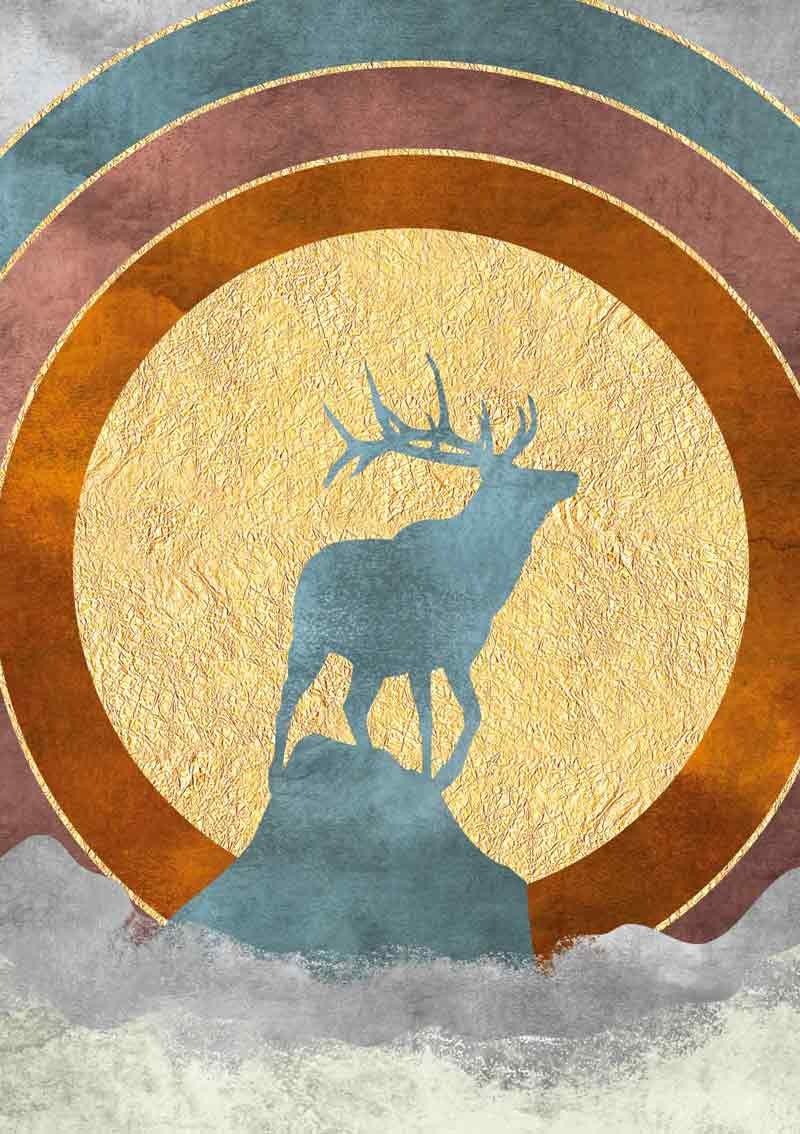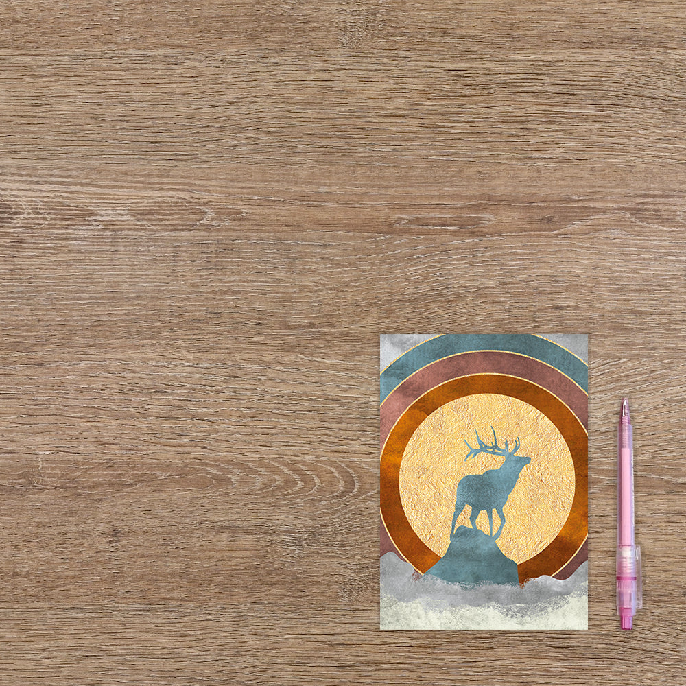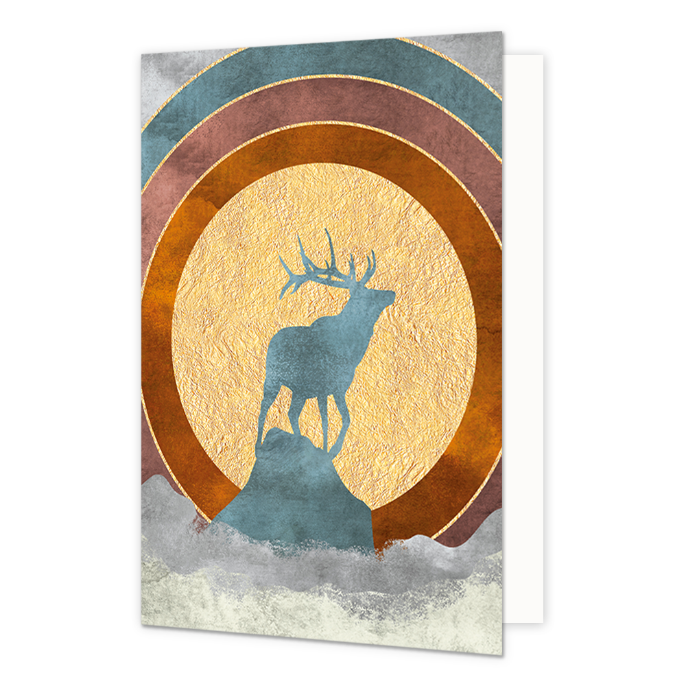 De wenskaart heeft een afmeting van x en een staande vorm. Op deze artistieke wenskaart staat een hert op een rots met de zon op de achtergrond. De binnenzijde van de wenskaart is blanco wat voldoende ruimte geeft om een persoonlijke boodschap te schrijven .