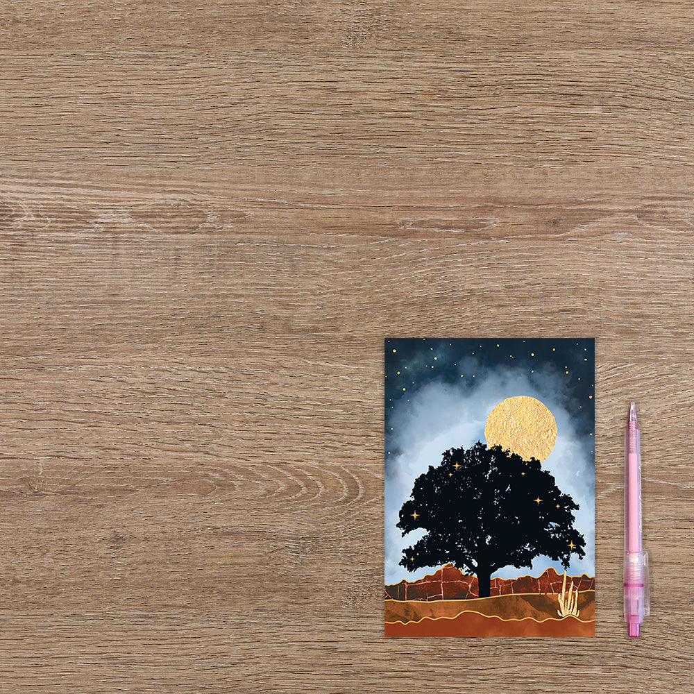 De wenskaart heeft een afmeting van x en een staande vorm. Op deze artistieke wenskaart staat een grote zwarte boom met een nachtlandschap van gras en de maan op de achtergrond. De binnenzijde van de wenskaart is blanco wat voldoende ruimte geeft om een persoonlijke boodschap te schrijven .