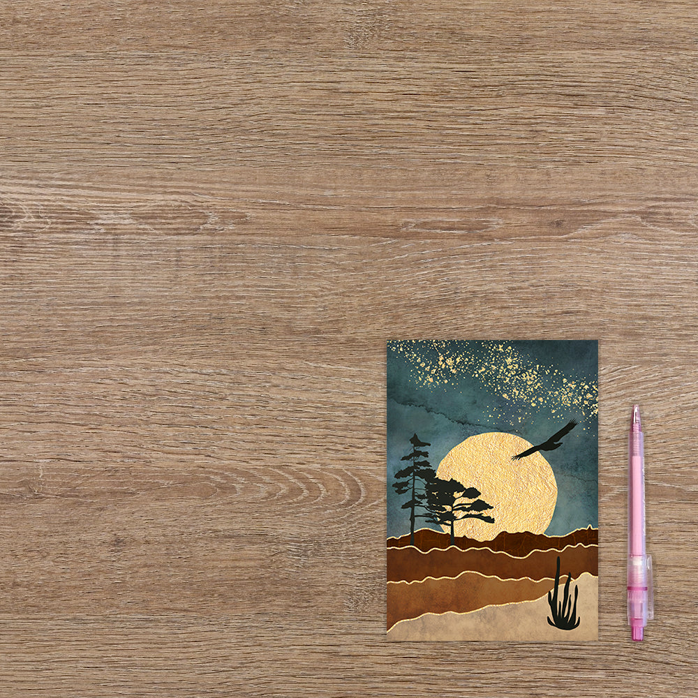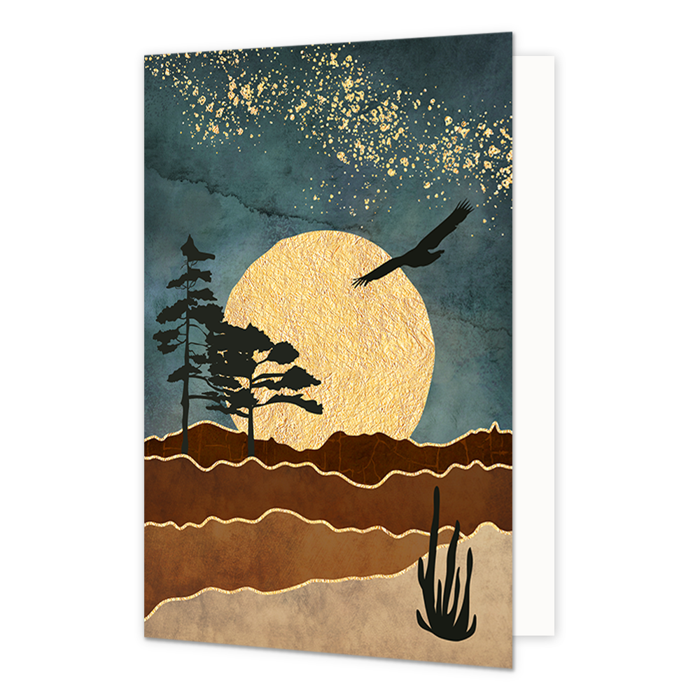 De wenskaart heeft een afmeting van x en een staande vorm. Op deze artistieke wenskaart staat een nachtlandschap waar een gouden maan, zwarte vogel en zwarte bomen staan. De binnenzijde van de wenskaart is blanco wat voldoende ruimte geeft om een persoonlijke boodschap te schrijven .