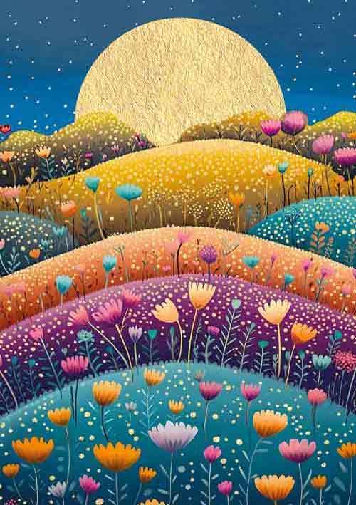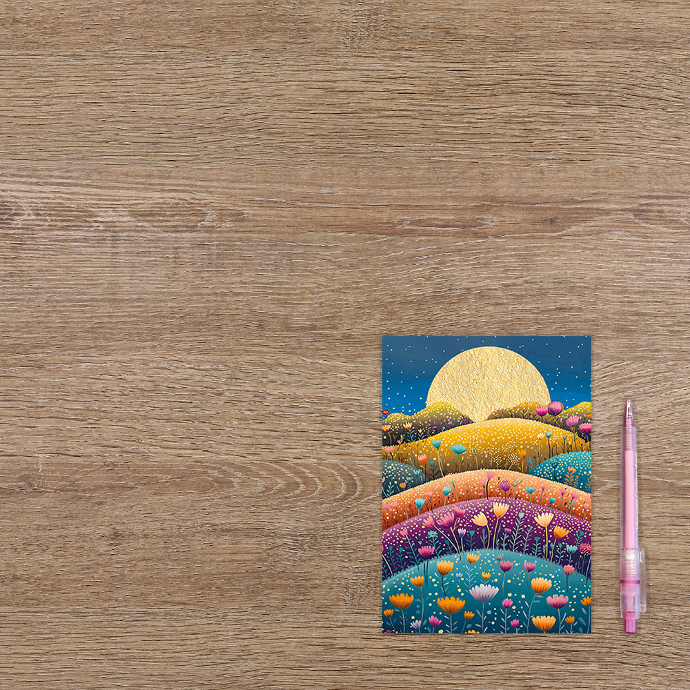 De wenskaart heeft een afmeting van x en een staande vorm. Op deze artistieke wenskaart staat een bloemenveld die uitkijkt op een gouden zon. De binnenzijde van de wenskaart is blanco wat voldoende ruimte geeft om een persoonlijke boodschap te schrijven .