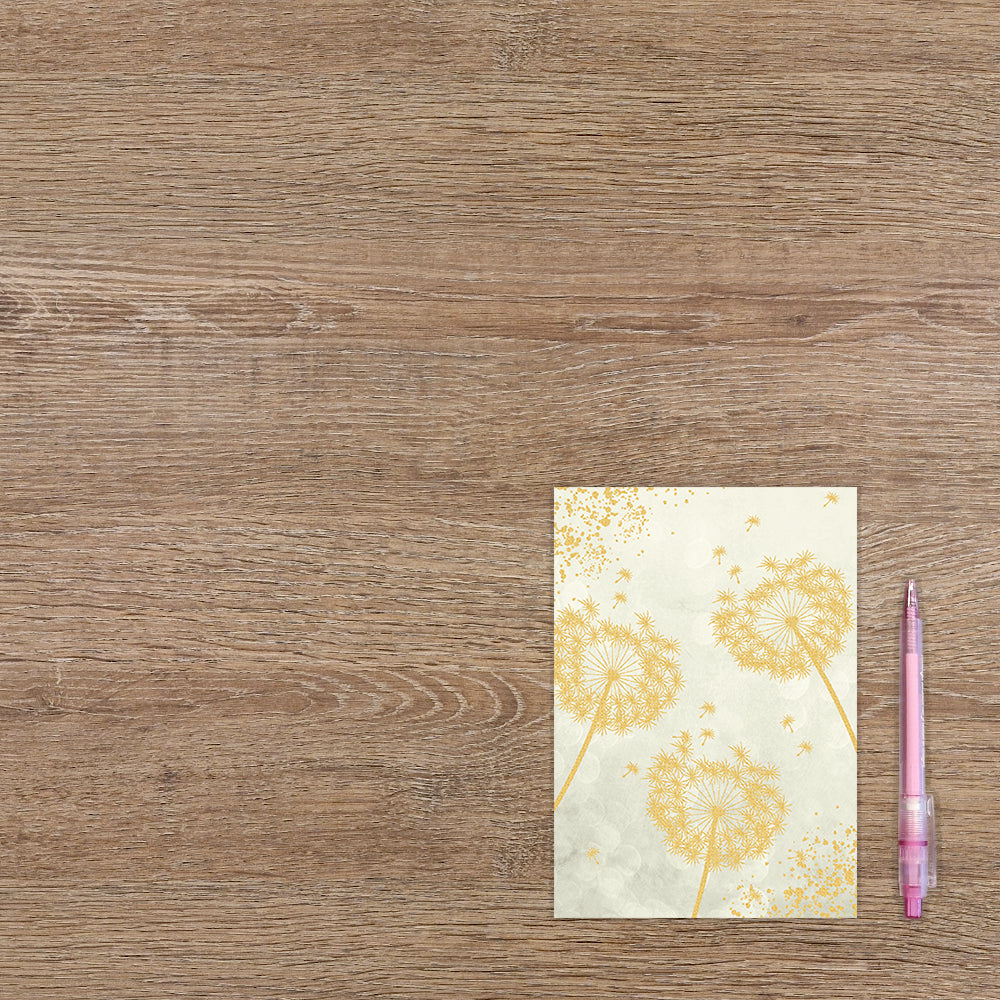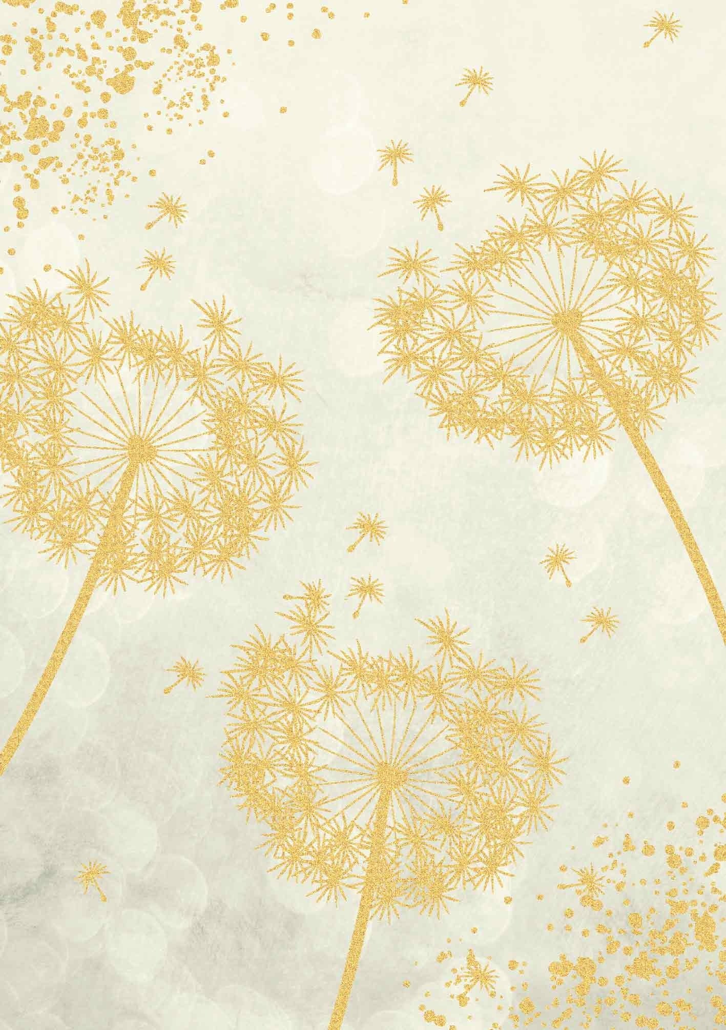 De wenskaart heeft een afmeting van x en een staande vorm. Op deze artistieke wenskaart staan drie gouden paardenbloemen op een beige achtergrond. De binnenzijde van de wenskaart is blanco wat voldoende ruimte geeft om een persoonlijke boodschap te schrijven .