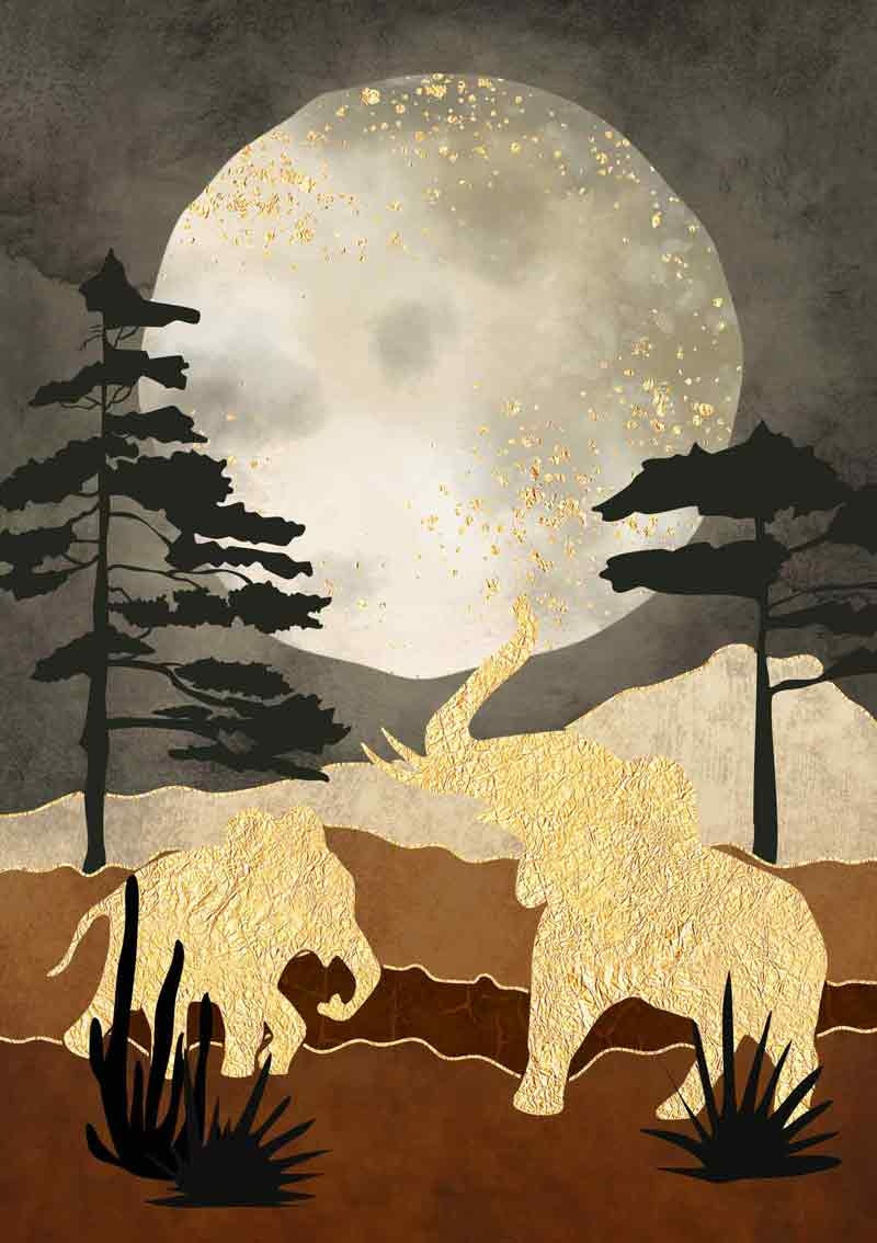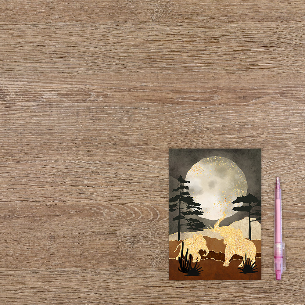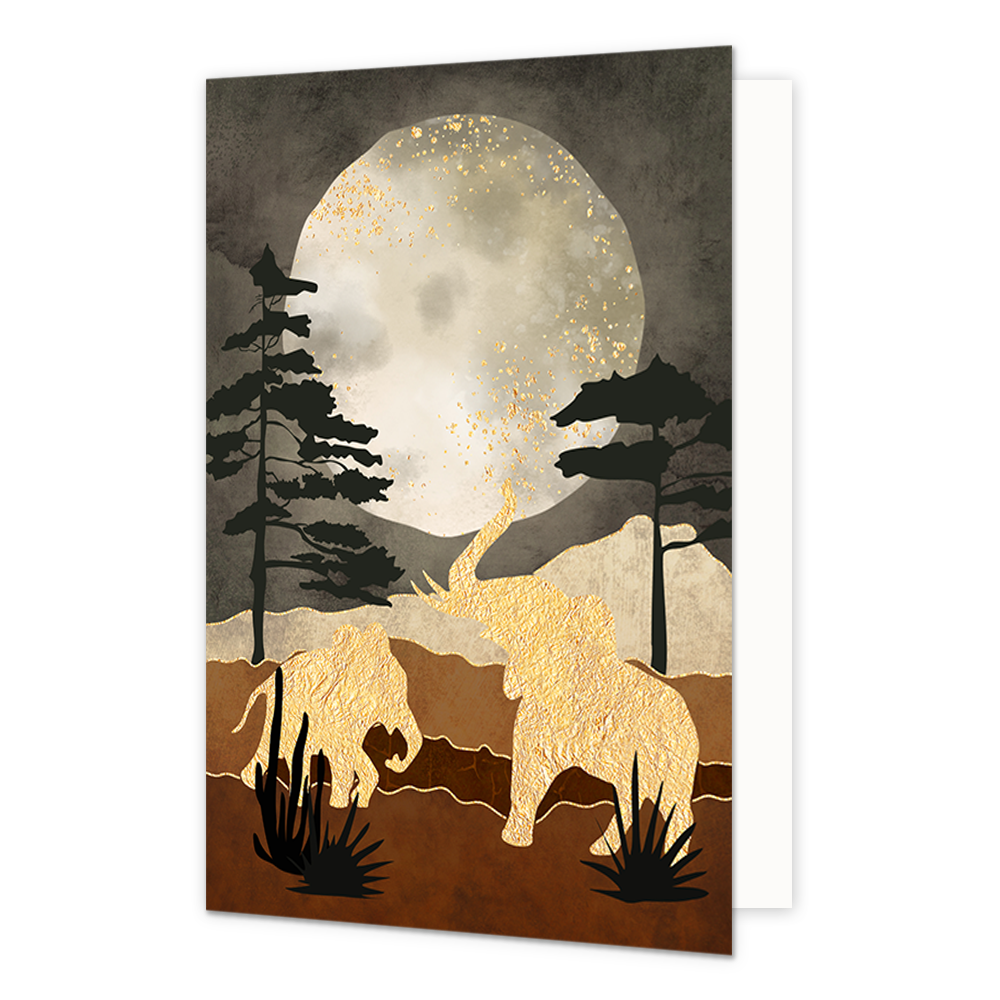 De wenskaart heeft een afmeting van x en een staande vorm. Op deze artistieke wenskaart staan twee gouden olifanten in een nachtlandschap. De binnenzijde van de wenskaart is blanco wat voldoende ruimte geeft om een persoonlijke boodschap te schrijven .