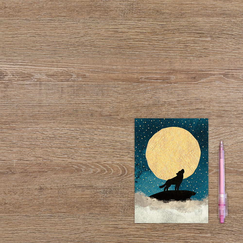 De wenskaart heeft een afmeting van x en een staande vorm. Op deze artistieke wenskaart staat een wolf die aan het huilen is op een rots met op de achtergrond een gouden maan. De binnenzijde van de wenskaart is blanco wat voldoende ruimte geeft om een persoonlijke boodschap te schrijven .