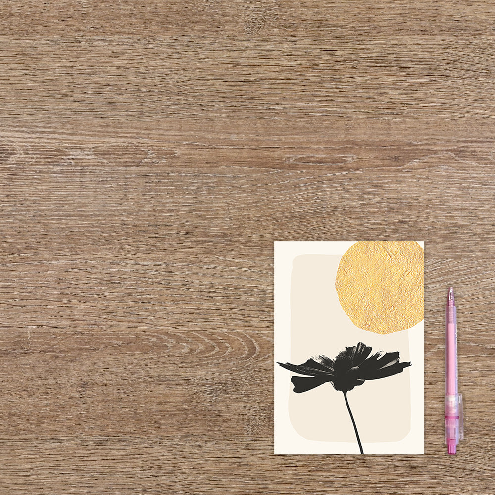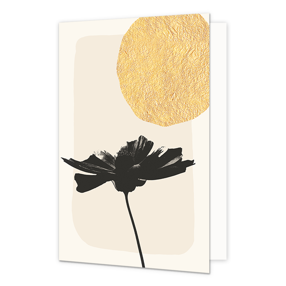 De wenskaart heeft een afmeting van x en een staande vorm. Op deze artistieke wenskaart staat een grote zwarte bloem op een beige achtergrond met een gouden zon. De binnenzijde van de wenskaart is blanco wat voldoende ruimte geeft om een persoonlijke boodschap te schrijven .