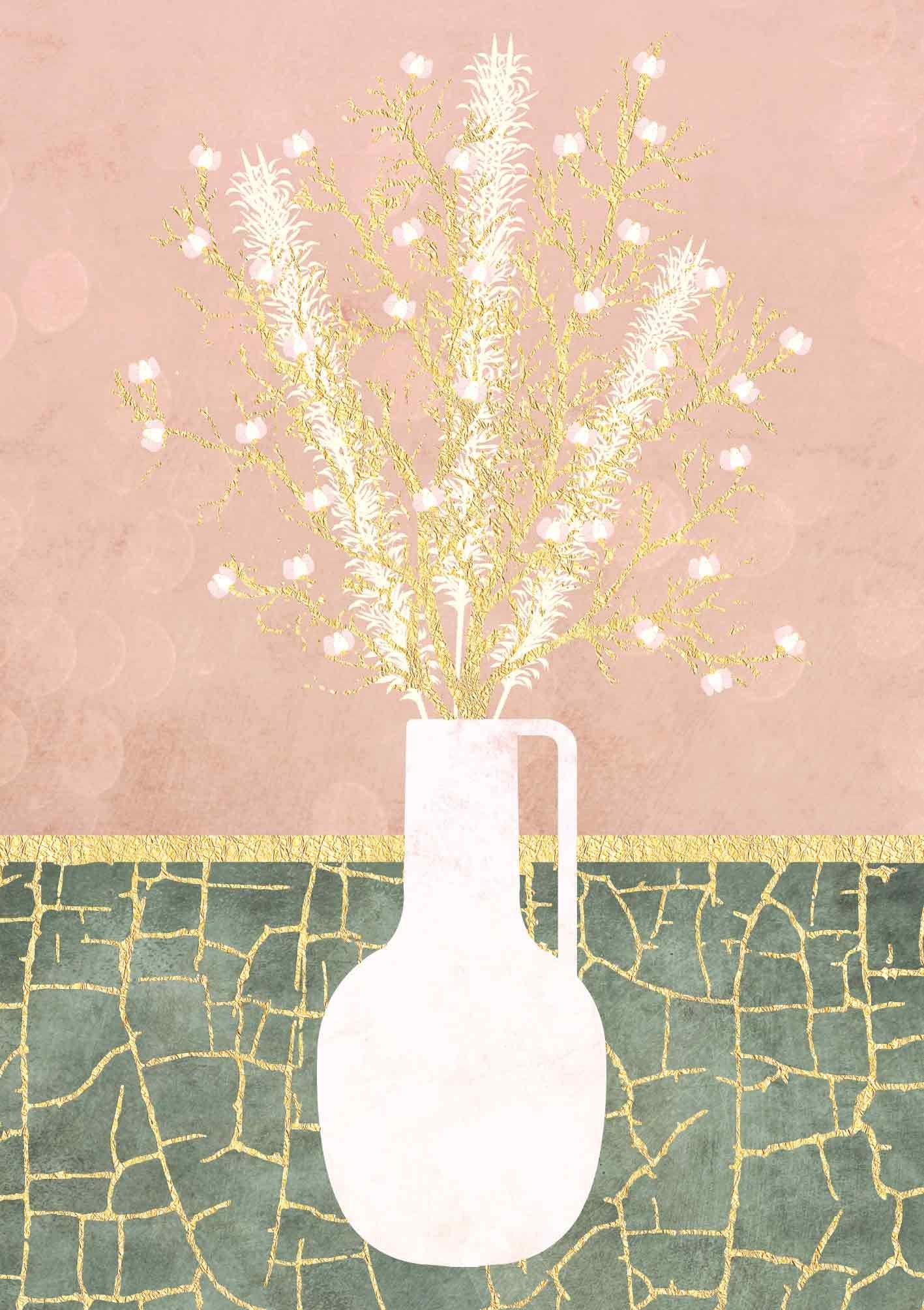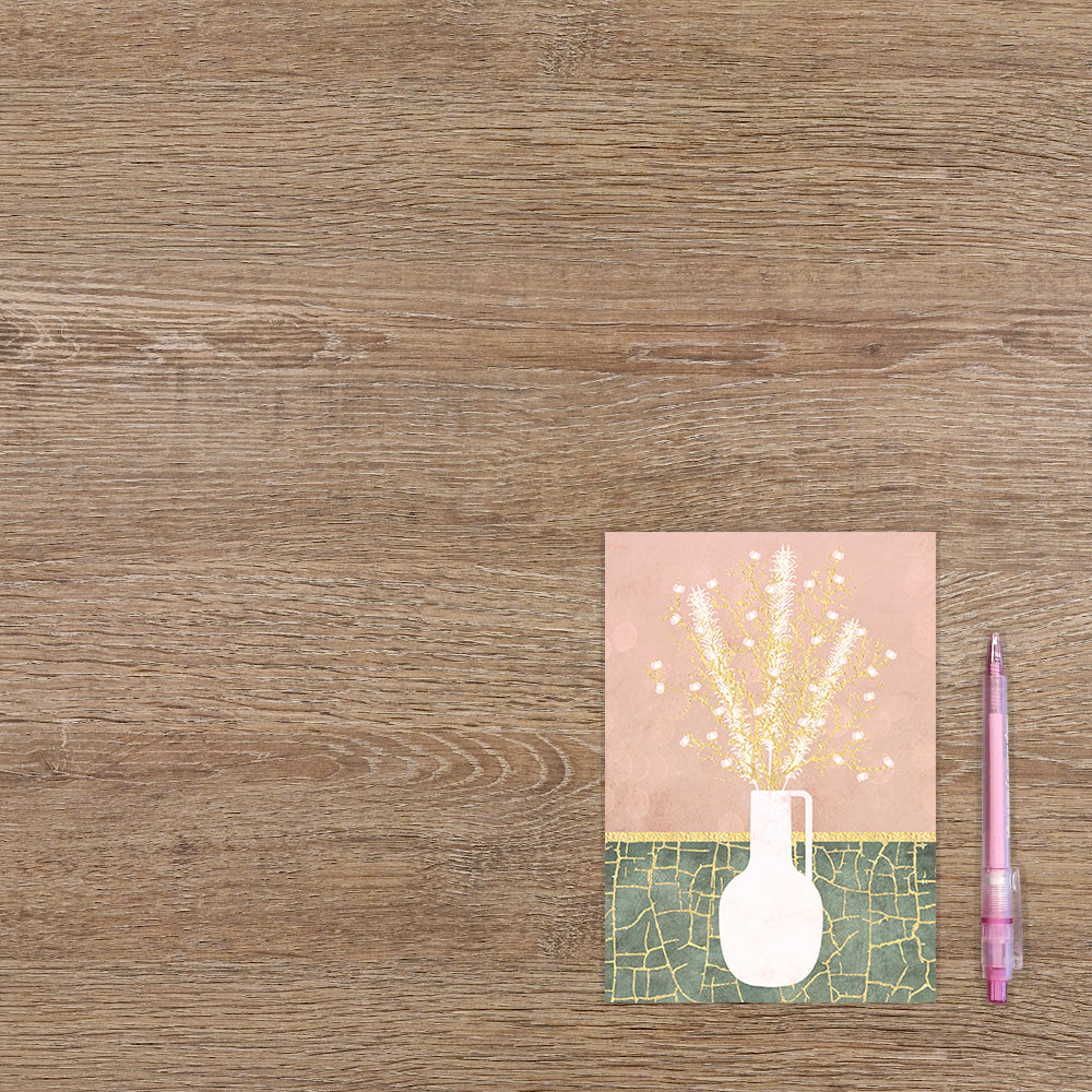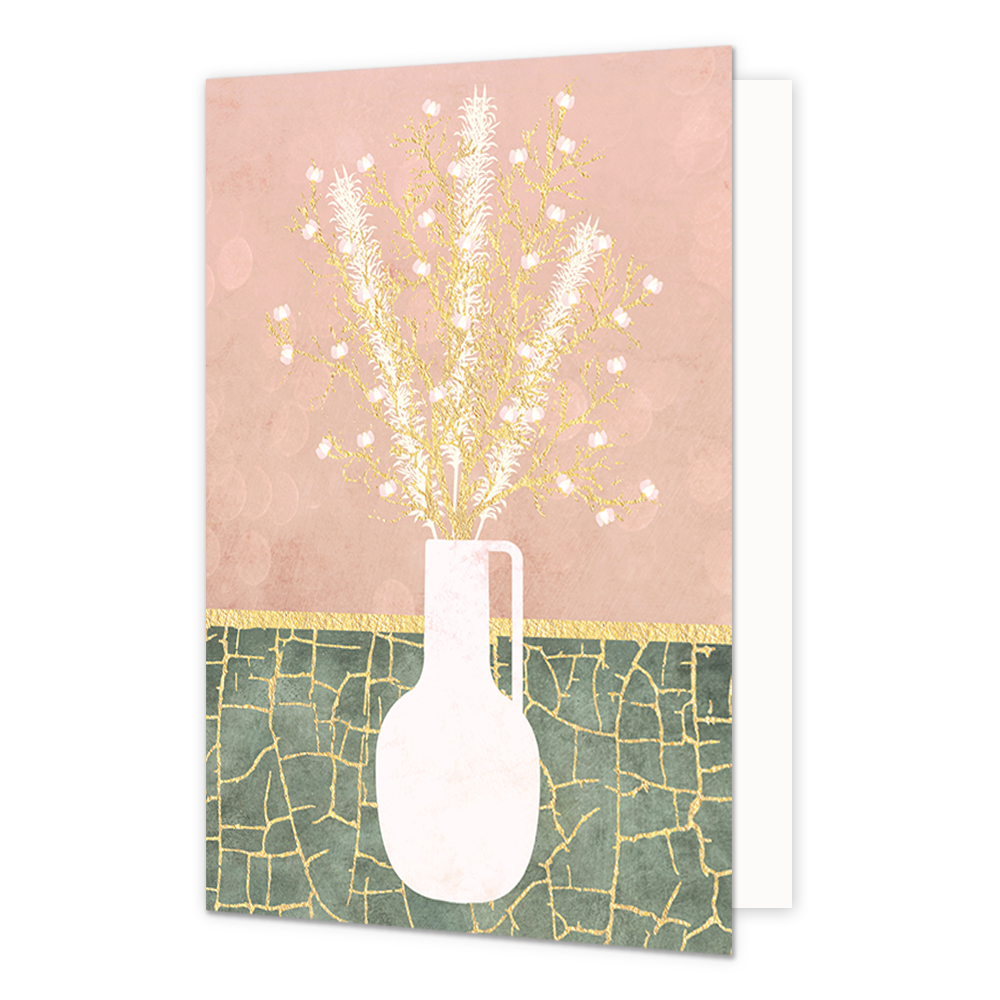 De wenskaart heeft een afmeting van x en een staande vorm. Op deze artistieke wenskaart staat een bloemenvaas met drie gouden droogbloemen erin. De binnenzijde van de wenskaart is blanco wat voldoende ruimte geeft om een persoonlijke boodschap te schrijven .