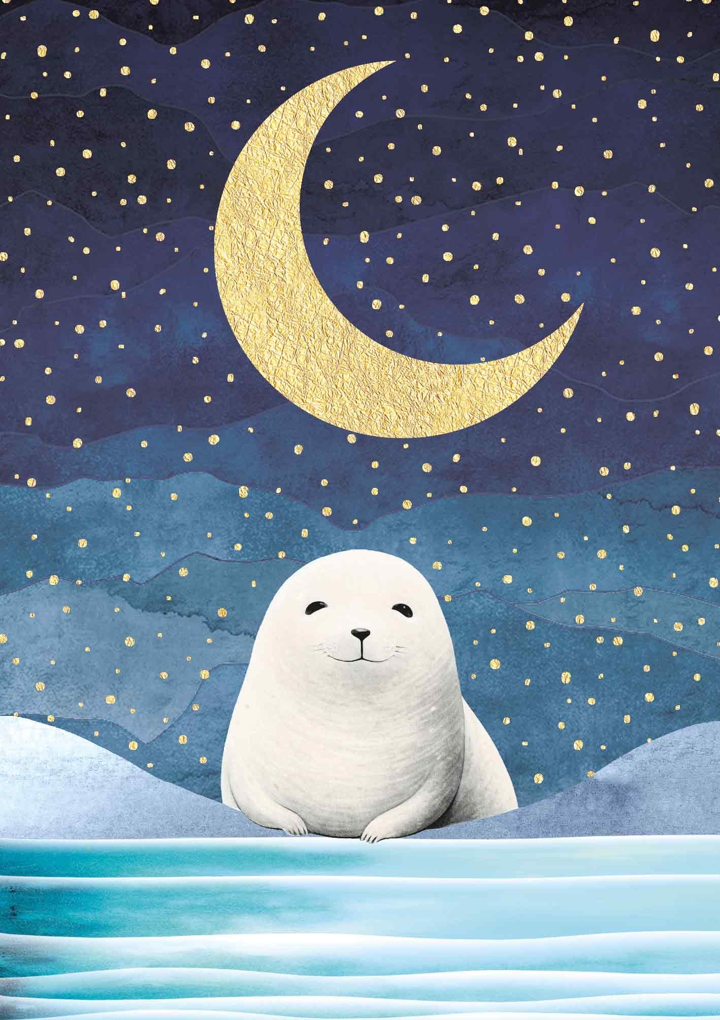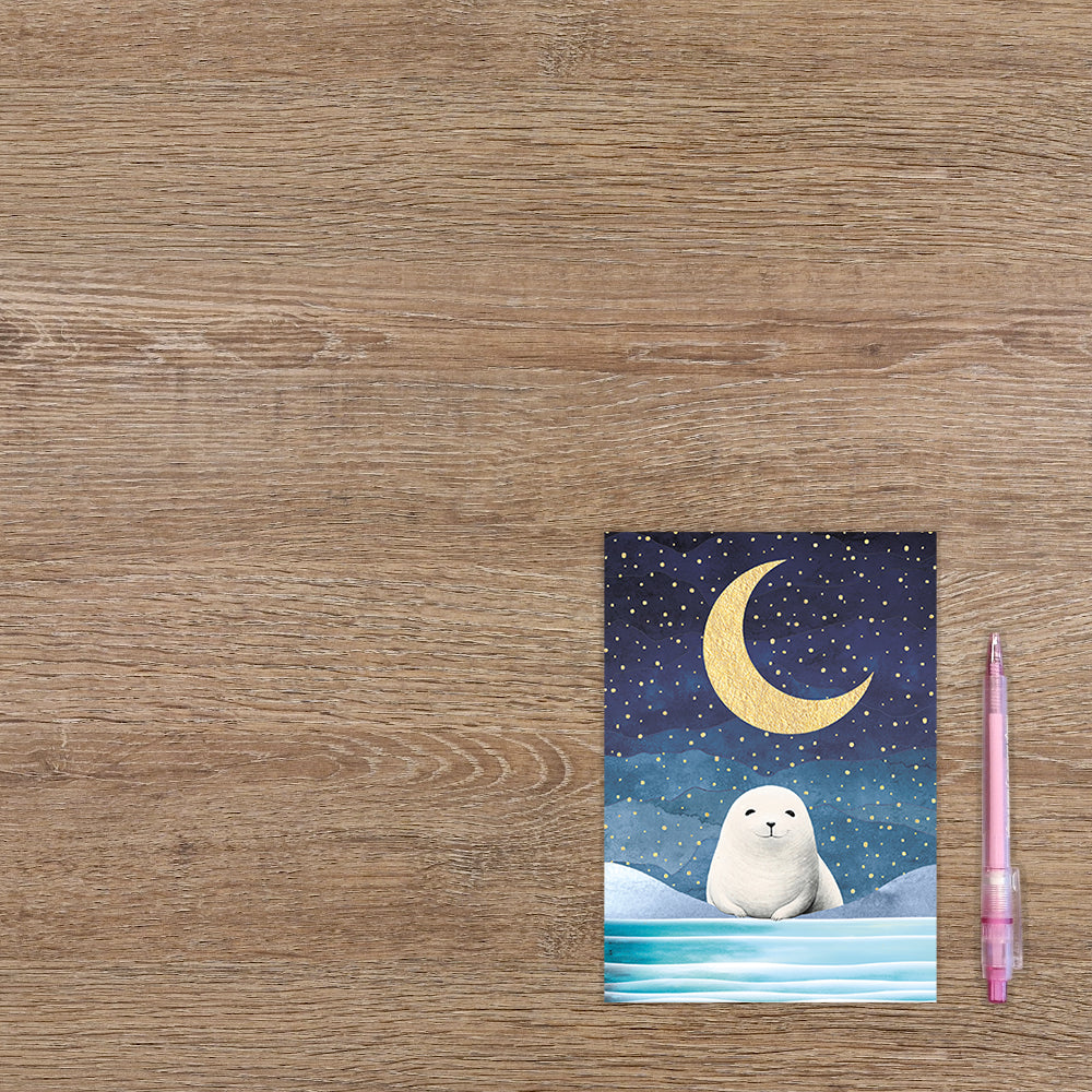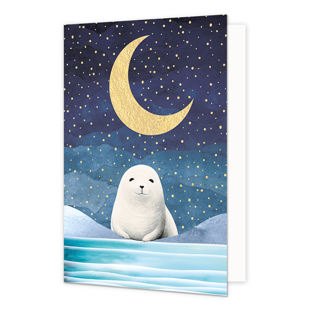 De wenskaart heeft een afmeting van x en een staande vorm. Op deze artstieke wenskaart staat een witte zeehond die op een ijsberg ligt met op de achtergrond een grote halve maan. De binnenzijde van de wenskaart is blanco wat voldoende ruimte geeft om een persoonlijke boodschap te schrijven .