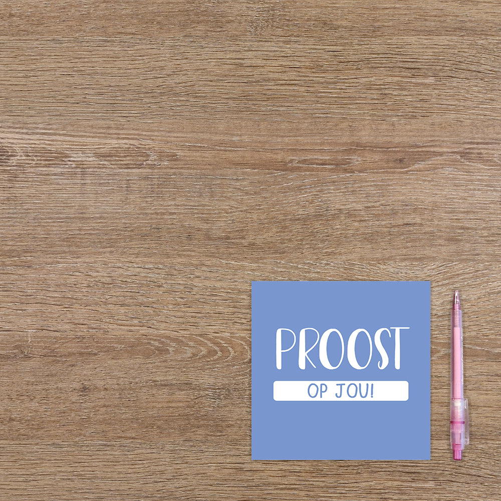 De wenskaart heeft een afmeting van x en een vierkante vorm. Op deze wenskaart staat de tekst: "Proost op jou!" De binnenzijde van de wenskaart is blanco wat voldoende ruimte geeft om een persoonlijke boodschap te schrijven .