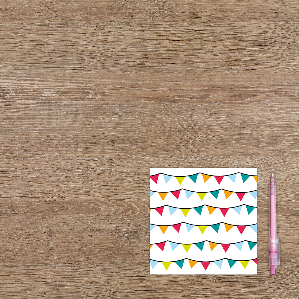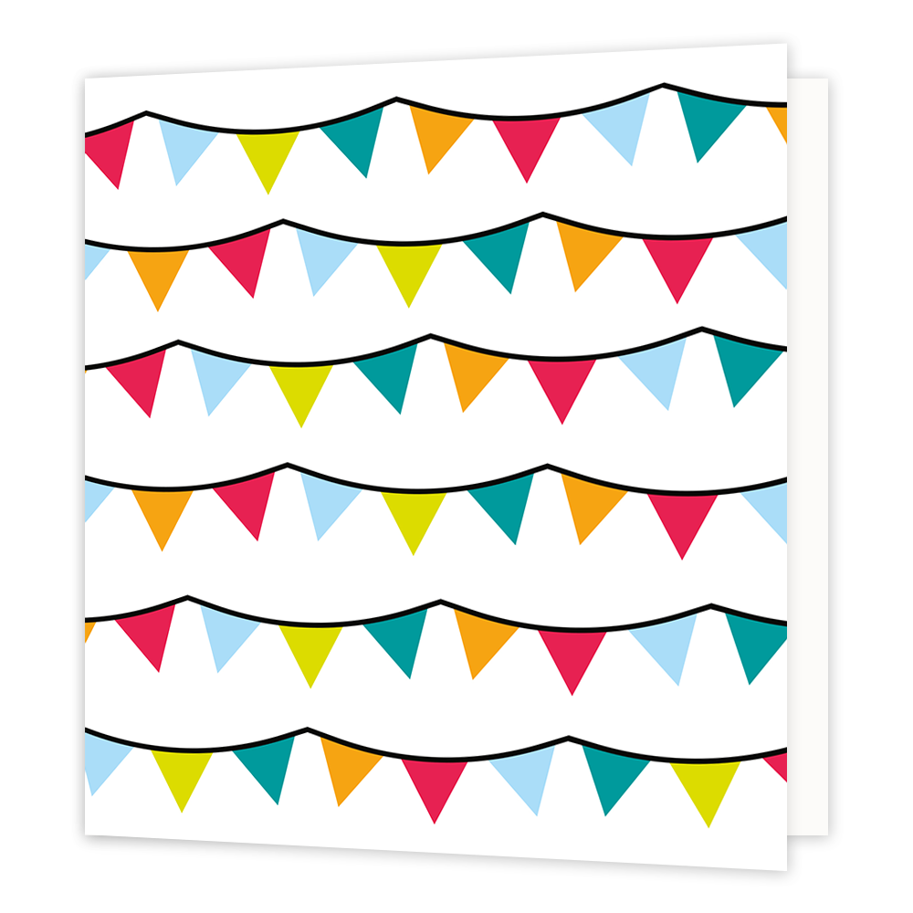 De wenskaart heeft een afmeting van x en een vierkante vorm. Op deze wenskaart staan slingers in de kleuren oranje, blauw, groen en rood. De binnenzijde van de wenskaart is blanco wat voldoende ruimte geeft om een persoonlijke boodschap te schrijven .