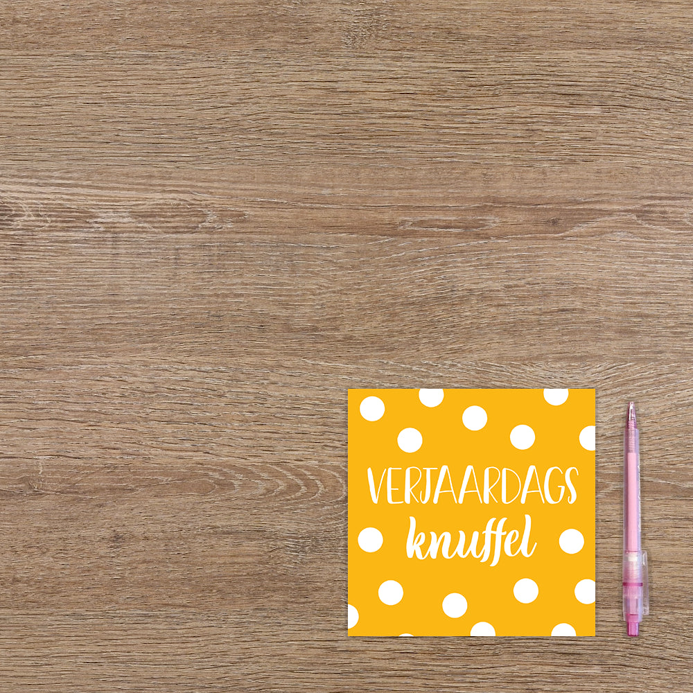 De wenskaart heeft een afmeting van x en een vierkante vorm. Op deze wenskaart staat de tekst: "Verjaardagsknufel" omringt door witte stippen. De binnenzijde van de wenskaart is blanco wat voldoende ruimte geeft om een persoonlijke boodschap te schrijven .