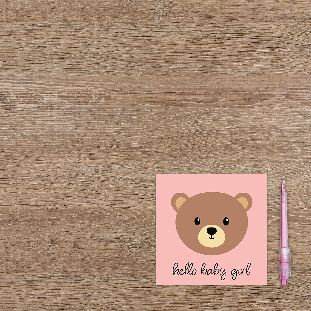 De wenskaart heeft een afmeting van x en een vierkante vorm. Op deze wenskaart staat een bruin beertje op een roze achtergrond met daaronder de tekst: "Hello baby girl". De binnenzijde van de wenskaart is blanco wat voldoende ruimte geeft om een persoonlijke boodschap te schrijven .