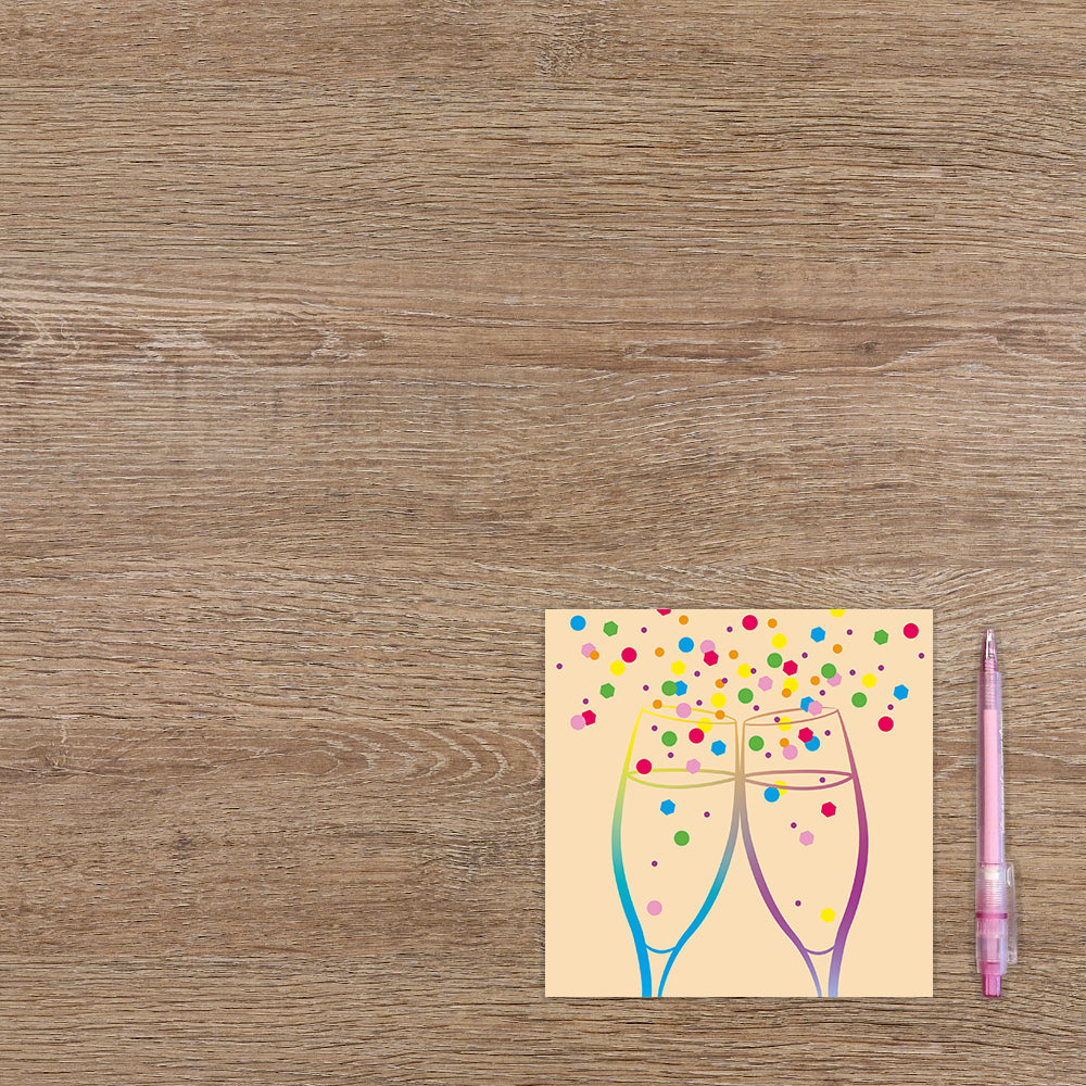 De wenskaart heeft een afmeting van x en een vierkante vorm. Op deze wenskaart staan twee champagneglazen waar confetti uit komt. De binnenzijde van de wenskaart is blanco wat voldoende ruimte geeft om een persoonlijke boodschap te schrijven .