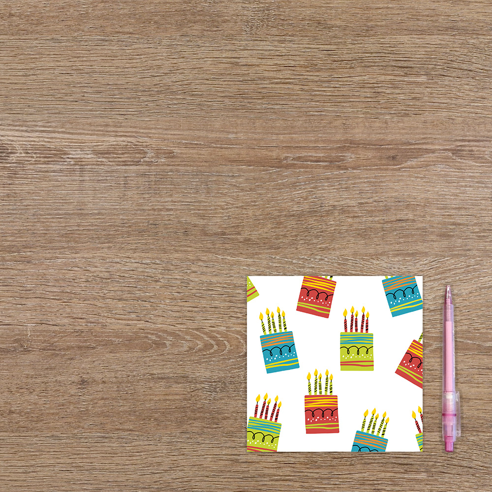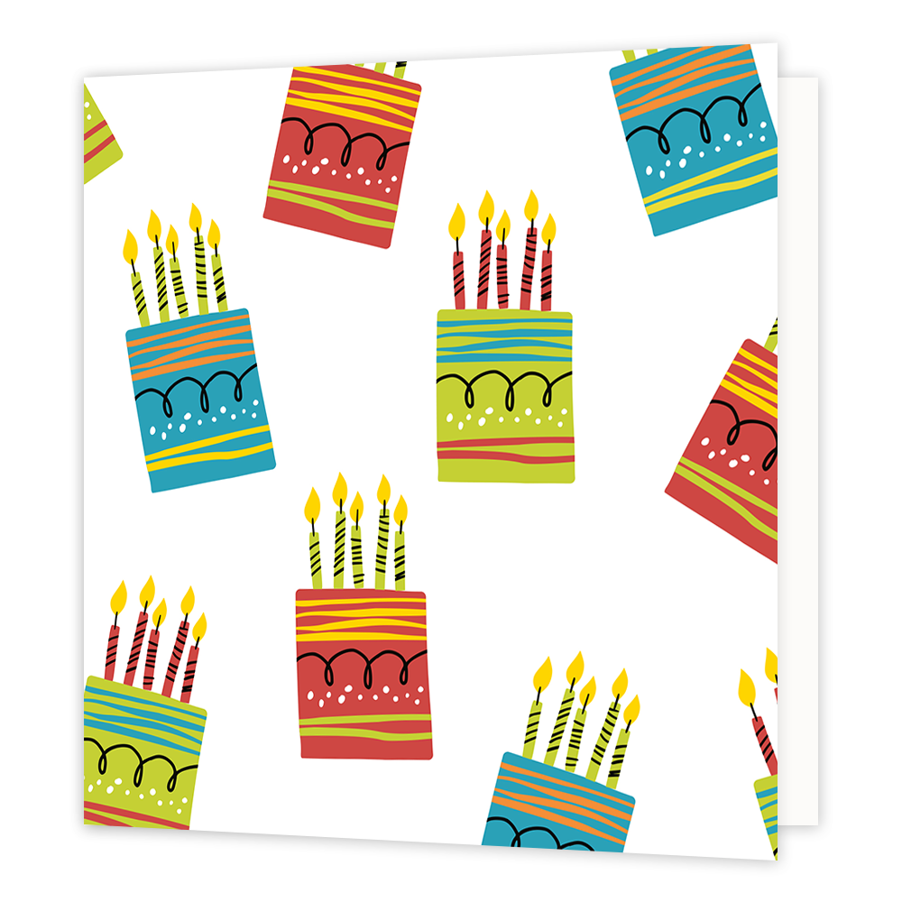 De wenskaart heeft een afmeting van x en een vierkante vorm. Op deze wenskaart staan taarten met kaarsjes erop. De binnenzijde van de wenskaart is blanco wat voldoende ruimte geeft om een persoonlijke boodschap te schrijven .