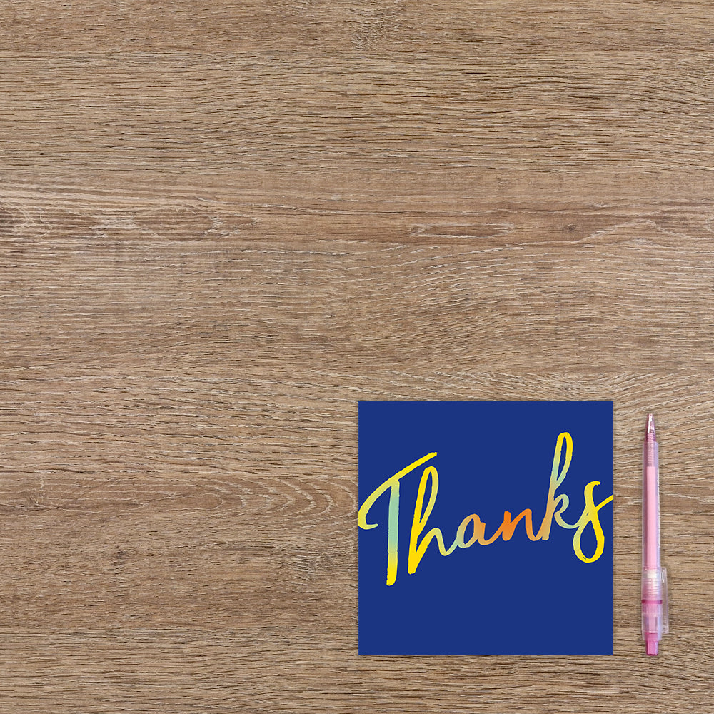De wenskaart heeft een afmeting van x en een vierkante vorm. Op deze wenskaart staat de tekst: "Thanks". De binnenzijde van de wenskaart is blanco wat voldoende ruimte geeft om een persoonlijke boodschap te schrijven .