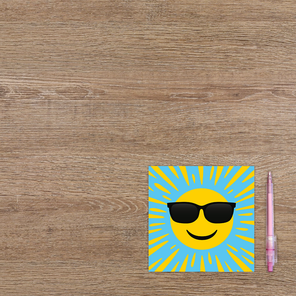 De wenskaart heeft een afmeting van x en een vierkante vorm. Op deze wenskaart staat een smiley zon met een zonnebril op. De binnenzijde van de wenskaart is blanco wat voldoende ruimte geeft om een persoonlijke boodschap te schrijven .