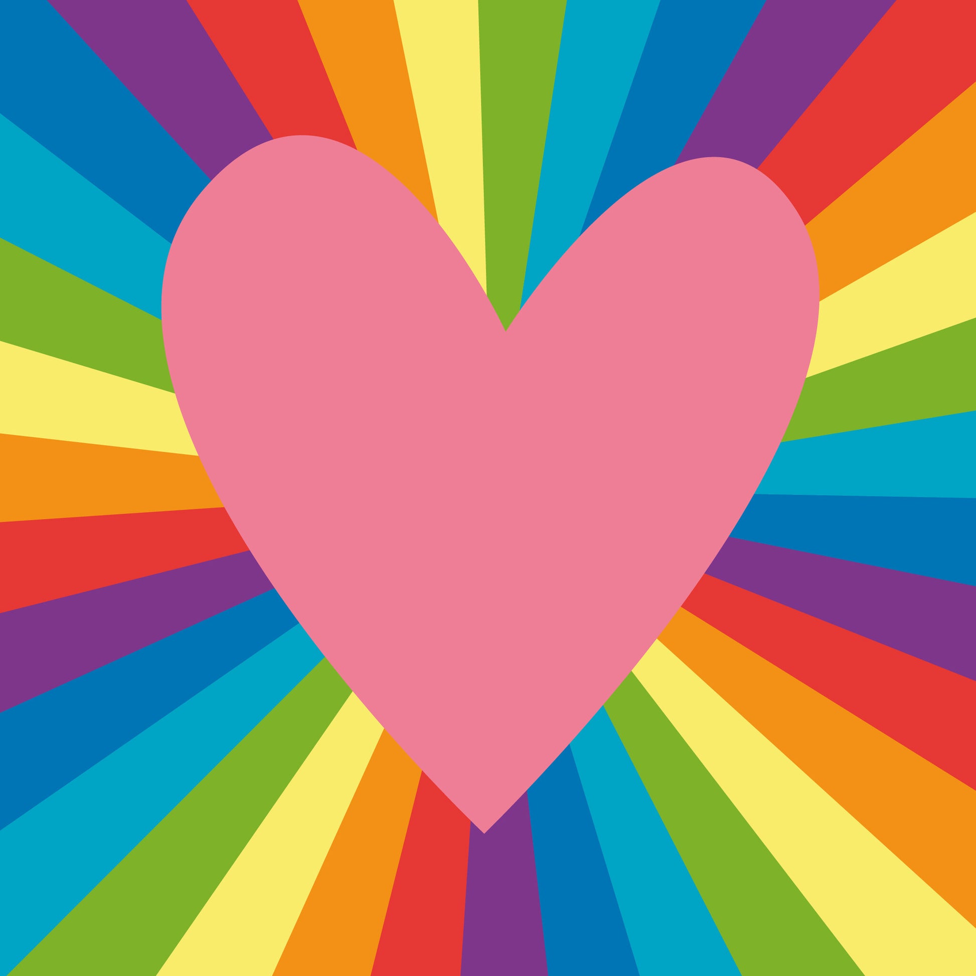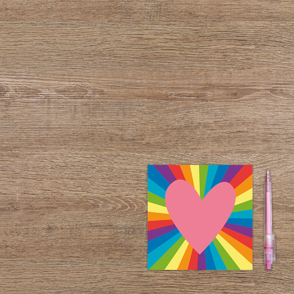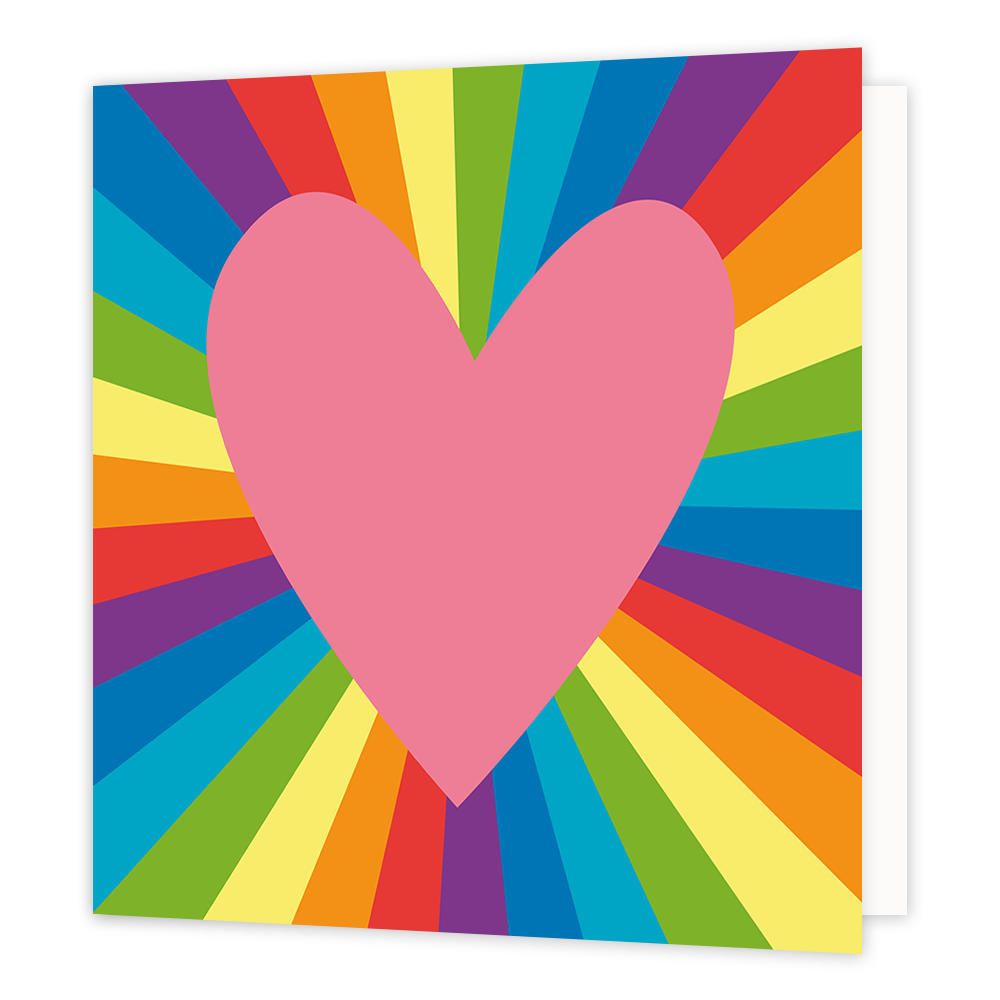 De wenskaart heeft een afmeting van x en een vierkante vorm. Op deze wenskaart staat een roze hart met op de achtergrond lijnen in regenboogkleuren. De binnenzijde van de wenskaart is blanco wat voldoende ruimte geeft om een persoonlijke boodschap te schrijven .