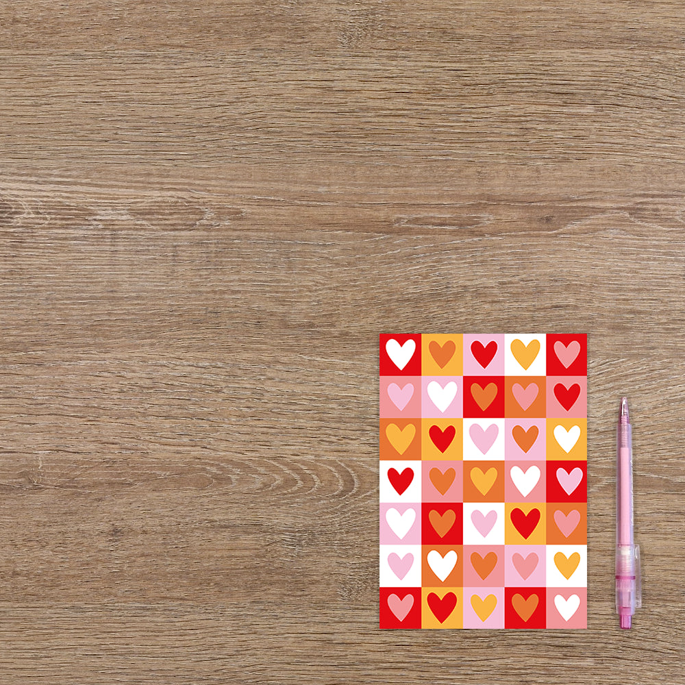 De wenskaart heeft een afmeting van x en een staande vorm. Op deze wenskaart staan vakjes met hartjes in de kleuren wit, rood, geel, roze en oranje. De binnenzijde van de wenskaart is blanco wat voldoende ruimte geeft om een persoonlijke boodschap te schrijven .