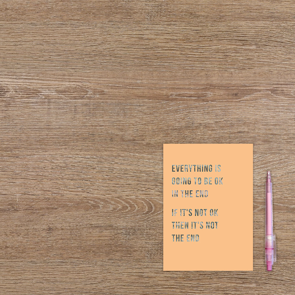 De wenskaart heeft een afmeting van x en een staande vorm. Op deze wenskaart staat de tekst: "Everything is going to be oke in the end. If it's not oke then it's not the end". De binnenzijde van de wenskaart is blanco wat voldoende ruimte geeft om een persoonlijke boodschap te schrijven .