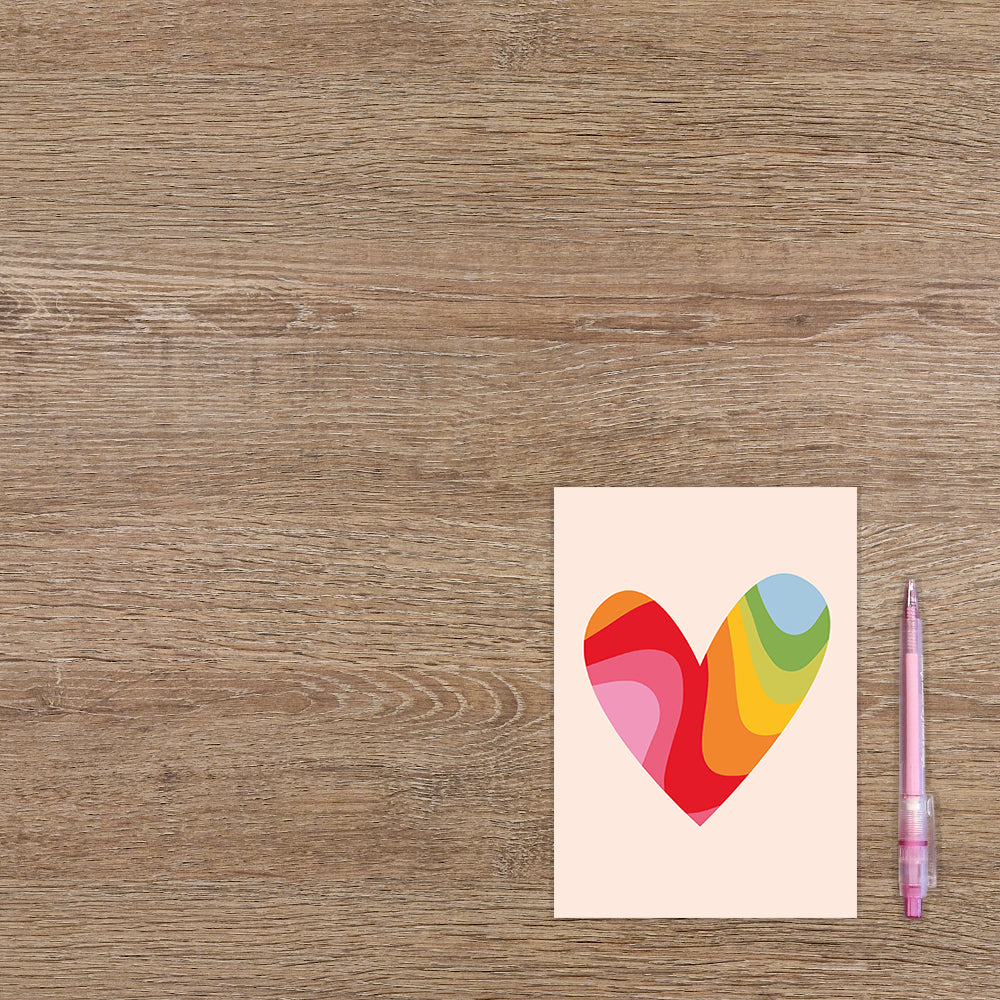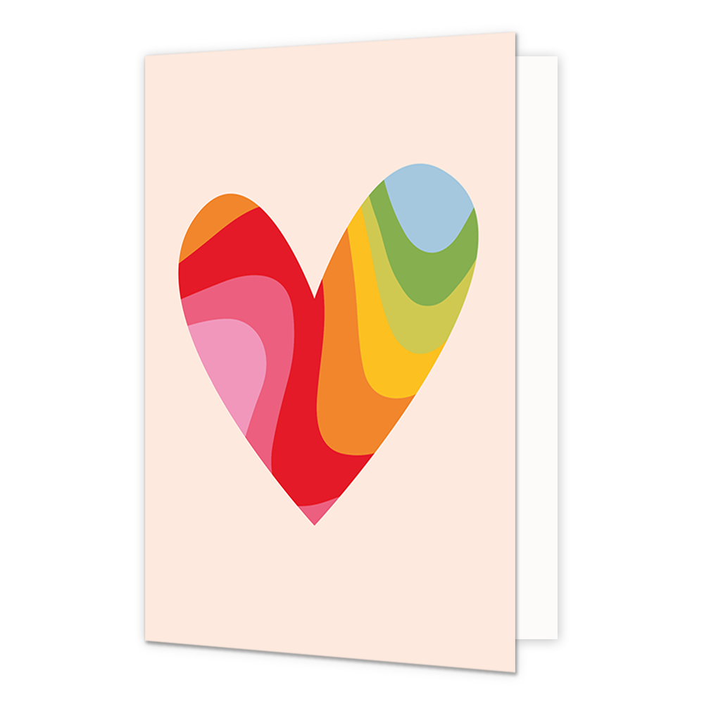 De wenskaart heeft een afmeting van x en een staande vorm. Op deze wenskaart staat een groot hart in regenboogkleuren, op een witte achtergrond. De binnenzijde van de wenskaart is blanco wat voldoende ruimte geeft om een persoonlijke boodschap te schrijven .
