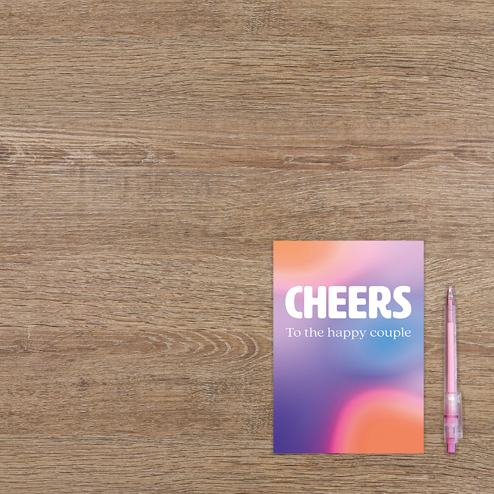 De wenskaart heeft een afmeting van x en een staande vorm. Op deze wenskaart staat de tekst: "Cheers to the happy couple" op een paars met blauw en oranje kleurige achtergrond. De binnenzijde van de wenskaart is blanco wat voldoende ruimte geeft om een persoonlijke boodschap te schrijven .