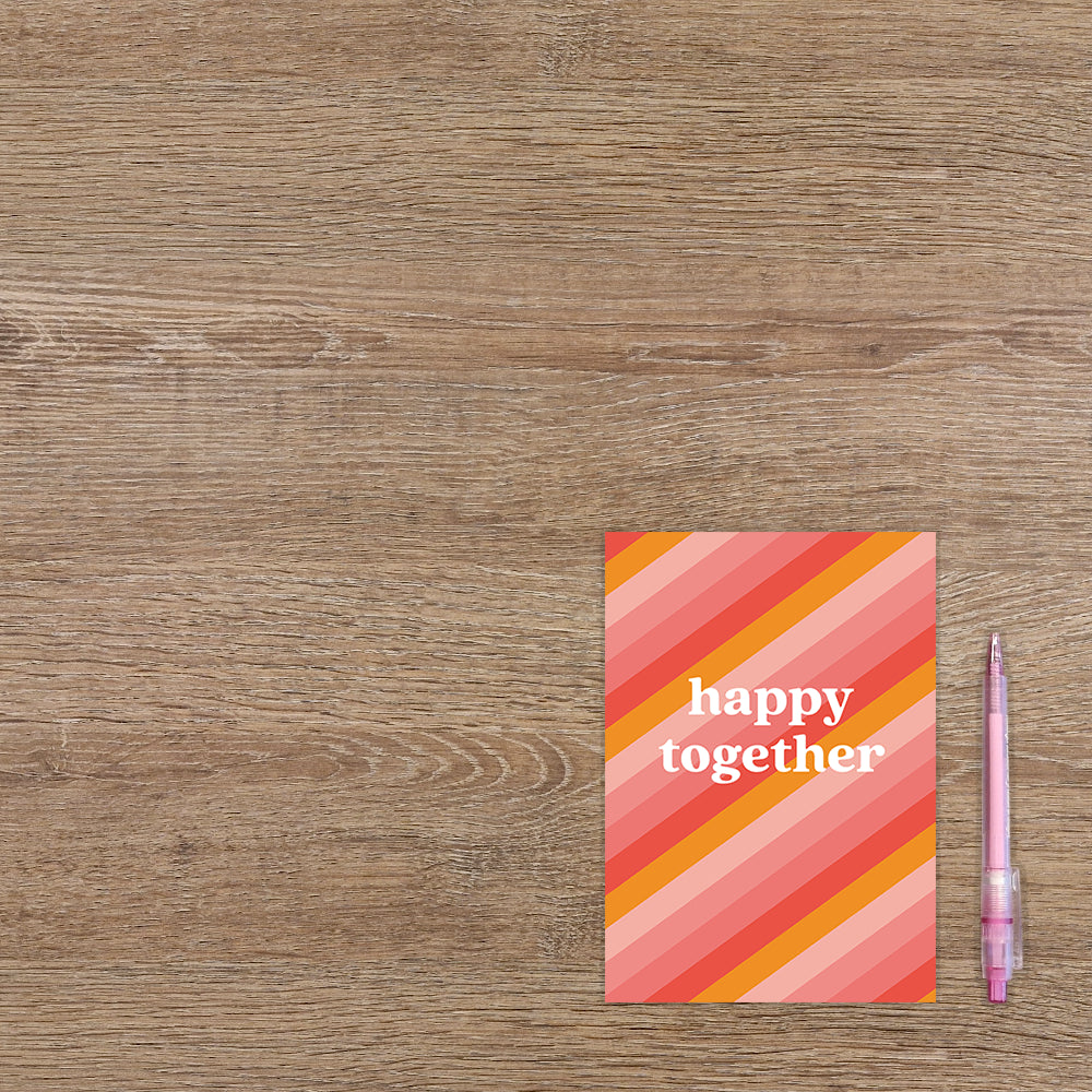 De wenskaart heeft een afmeting van x en een staande vorm. Op deze wenskaart staan lijnen in diverse kleuren roze, oranje en rood, met in het midden de tekst: "Happy together". De binnenzijde van de wenskaart is blanco wat voldoende ruimte geeft om een persoonlijke boodschap te schrijven .