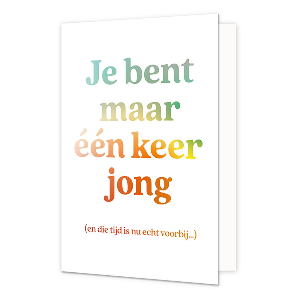De wenskaart heeft een afmeting van x en een staande vorm. Op deze wenskaart staat de tekst: "Je bent maar één keer jong (en die tijd is nu echt voorbij)". De binnenzijde van de wenskaart is blanco wat voldoende ruimte geeft om een persoonlijke boodschap te schrijven .