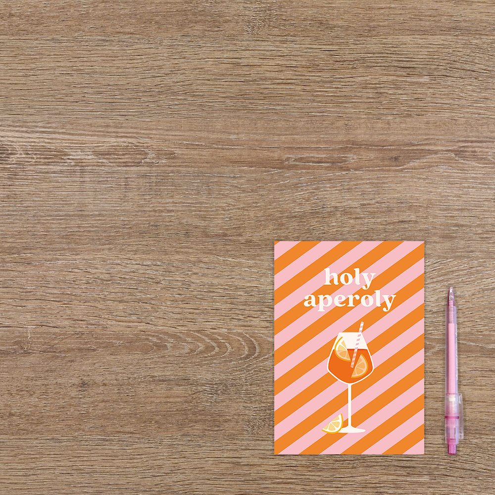 De wenskaart heeft een afmeting van x en een staande vorm. Op deze wenskaart staat een Aperol Spritz met daarboven de tekst: "Holy aperoly". De binnenzijde van de wenskaart is blanco wat voldoende ruimte geeft om een persoonlijke boodschap te schrijven .