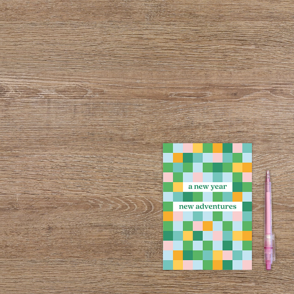 De wenskaart heeft een afmeting van x en een staande vorm. Op deze wenskaart staan allemaal vierkante vakjes in de kleuren groen, blauw, roze, geel en oranje, met in het midden de tekst: "A new year new adventures". De binnenzijde van de wenskaart is blanco wat voldoende ruimte geeft om een persoonlijke boodschap te schrijven .