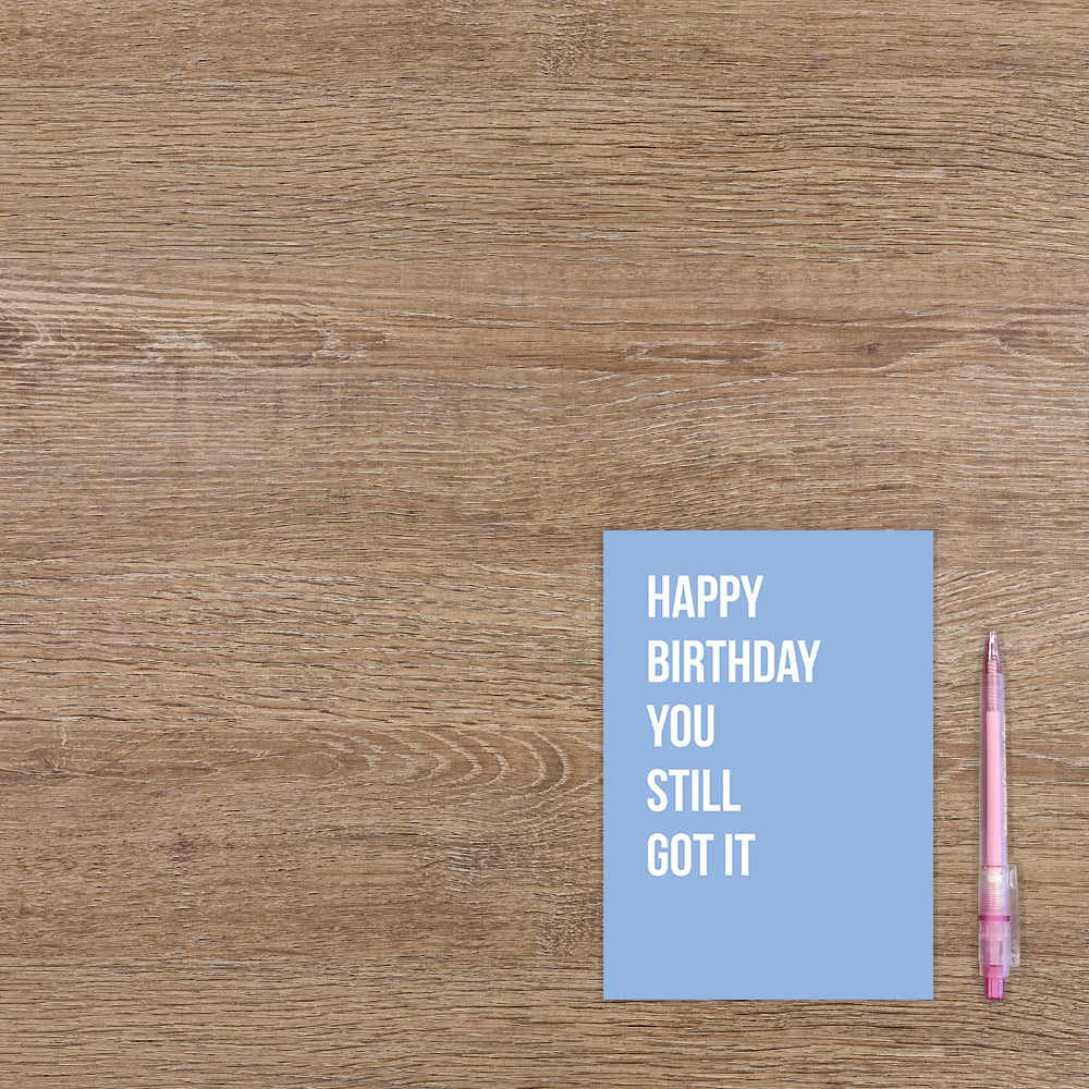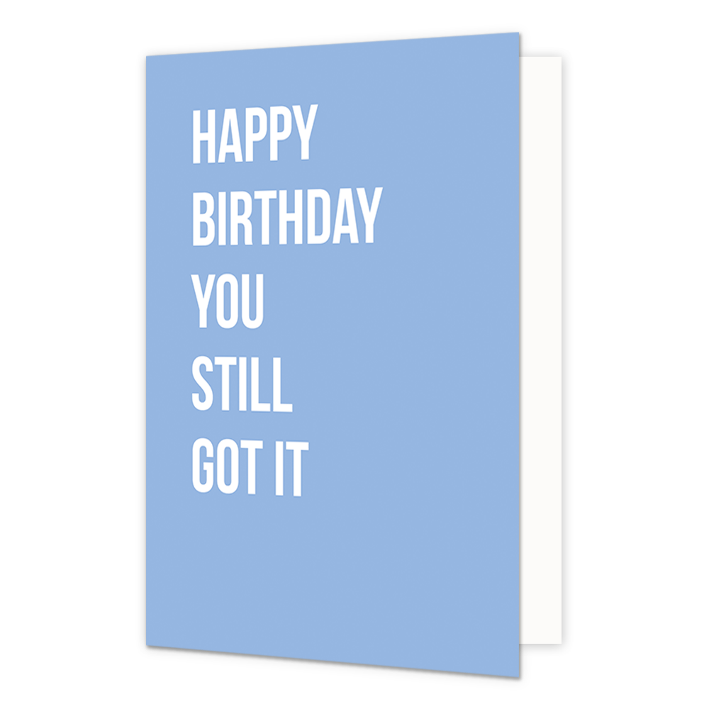 De wenskaart heeft een afmeting van x en een staande vorm. Op deze wenskaart staat de tekst: "Happy birthday you still got it" op een blauwe achtergrond. De binnenzijde van de wenskaart is blanco wat voldoende ruimte geeft om een persoonlijke boodschap te schrijven .