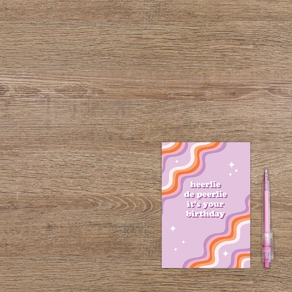 De wenskaart heeft een afmeting van x en een staande vorm. Op deze wenskaart staan lijnen in de kleuren wit, oranje, roze en paars, met in het midden de tekst: "Heerlie de peerlie it's your birthday". De binnenzijde van de wenskaart is blanco wat voldoende ruimte geeft om een persoonlijke boodschap te schrijven .
