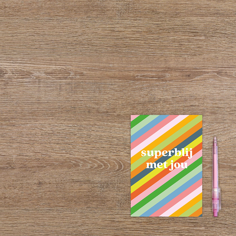 De wenskaart heeft een afmeting van x en een staande vorm. Op deze wenskaart staan lijnen in de kleuren roze, groen, blauw, oranje, geel en rood, met in het midden de tekst: "Superblij met jou". De binnenzijde van de wenskaart is blanco wat voldoende ruimte geeft om een persoonlijke boodschap te schrijven .