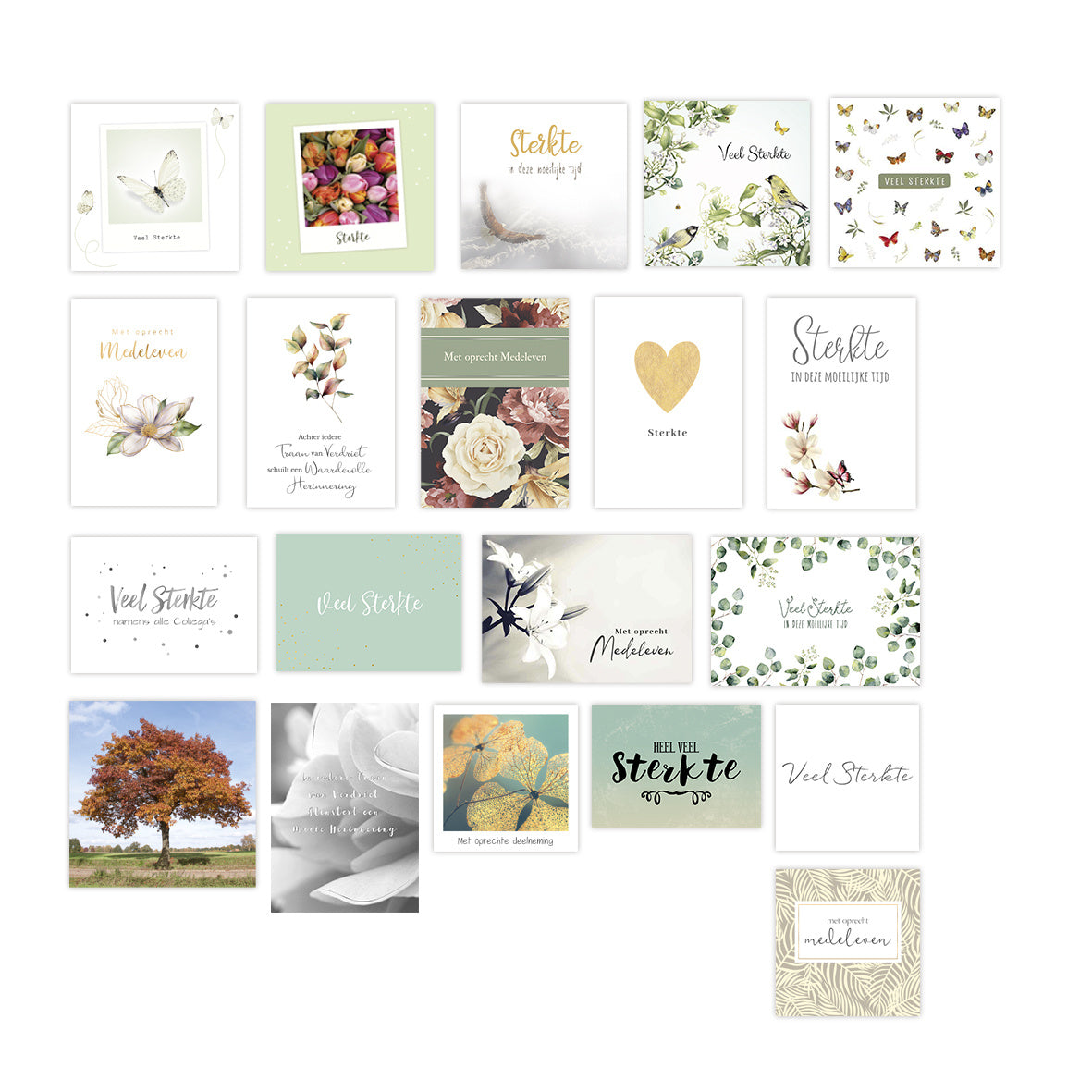 In deze wenskaartenset vind je 20 unieke wenskaarten, geschikt voor condoleance. Alle wenskaarten worden geleverd inclusief bijpassende envelop.