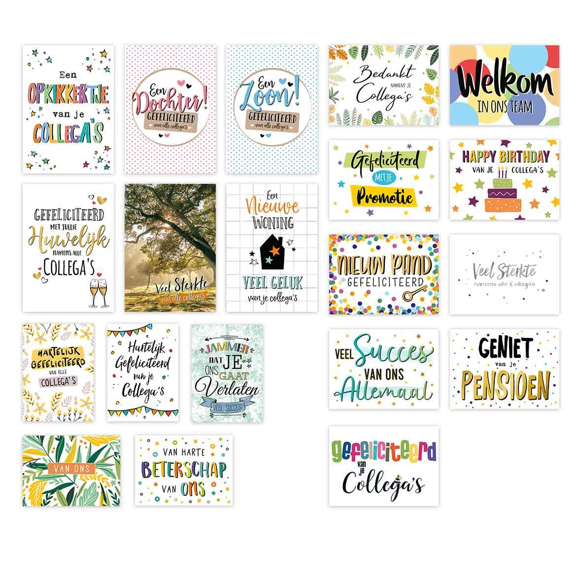 In deze wenskaartenset vind je 20 unieke wenskaarten, geschikt voor collega's. Alle wenskaarten worden geleverd inclusief bijpassende envelop.