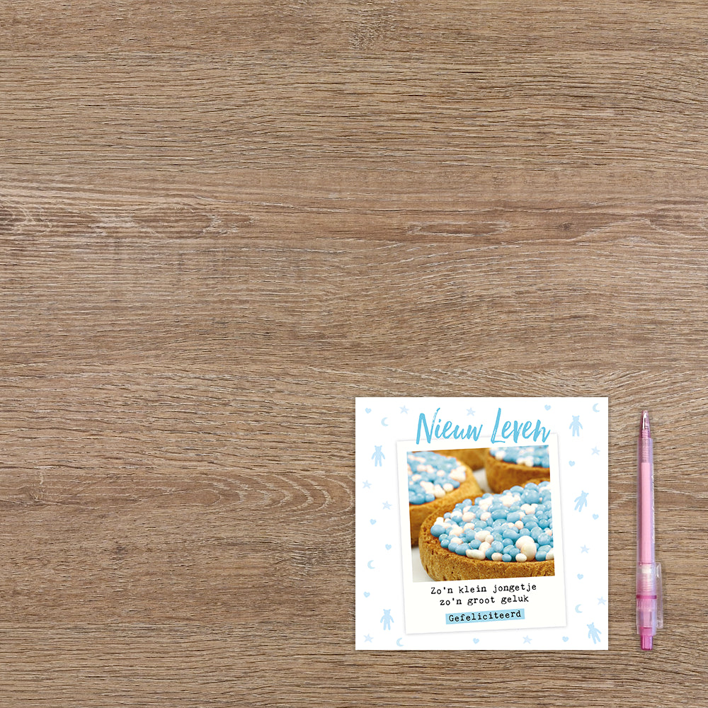 De wenskaart heeft een afmeting van x en een vierkante vorm. Op deze wenskaart staan beschuit met blauwe muisjes. In de illustratie staat de tekst: "Nieuw leven zo'n klein jongetje zo'n groot geluk gefeliciteerd". De binnenzijde van de wenskaart is blanco wat voldoende ruimte geeft om een persoonlijke boodschap te schrijven .