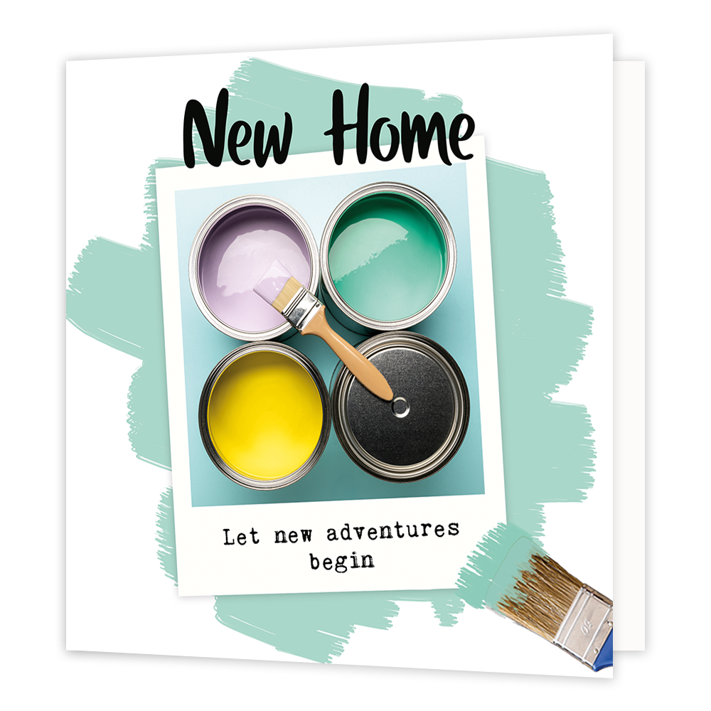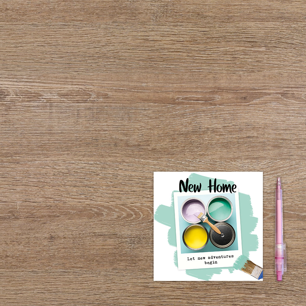 De wenskaart heeft een afmeting van x en een vierkante vorm. Op deze wenskaart staan vier potten met verf. In de illustratie staat de tekst: "New home let new adventures begin". De binnenzijde van de wenskaart is blanco wat voldoende ruimte geeft om een persoonlijke boodschap te schrijven .