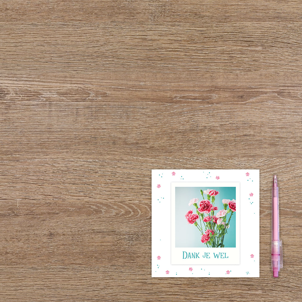 De wenskaart heeft een afmeting van x en een vierkante vorm. Op deze wenskaart staan roze bloemen met daaronder de tekst: "Dank je wel". De binnenzijde van de wenskaart is blanco wat voldoende ruimte geeft om een persoonlijke boodschap te schrijven .