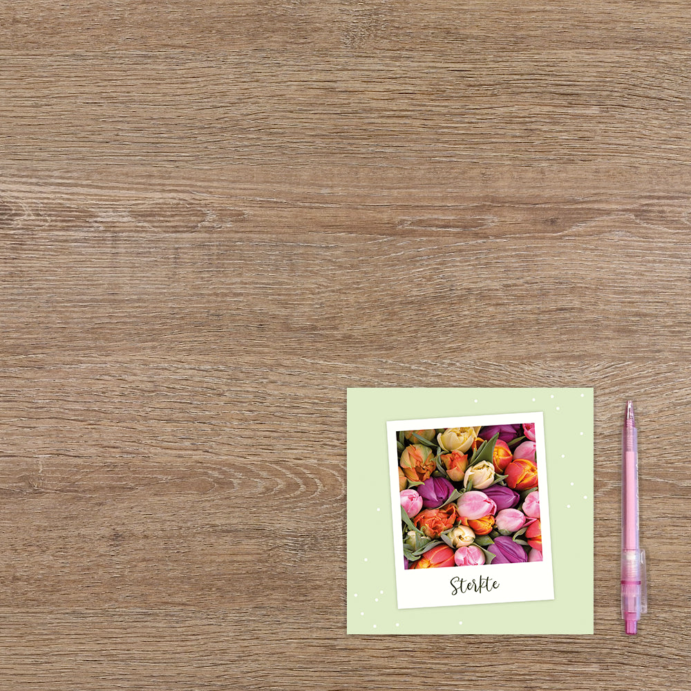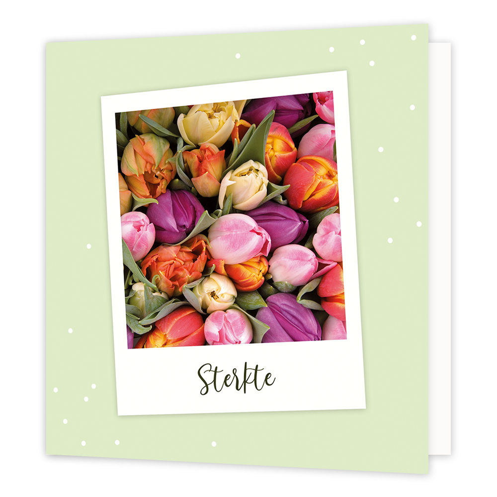 De wenskaart heeft een afmeting van x en een vierkante vorm. Op deze wenskaart staan tulpen in diverse kleuren met daaronder de tekst: "Sterkte". De binnenzijde van de wenskaart is blanco wat voldoende ruimte geeft om een persoonlijke boodschap te schrijven .