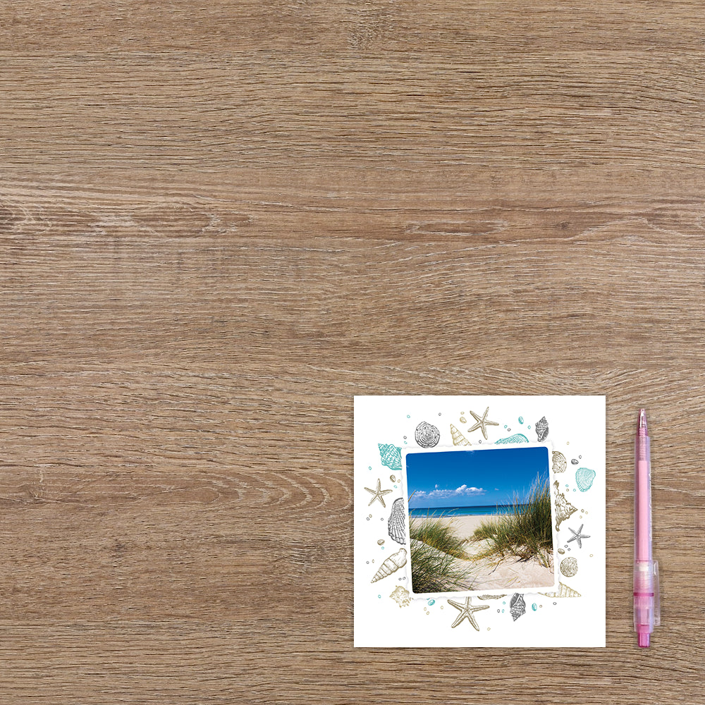 De wenskaart heeft een afmeting van x en een vierkante vorm. Op deze wenskaart staan duinen die uitlopen op een strand met een blauwe zee. De binnenzijde van de wenskaart is blanco wat voldoende ruimte geeft om een persoonlijke boodschap te schrijven .