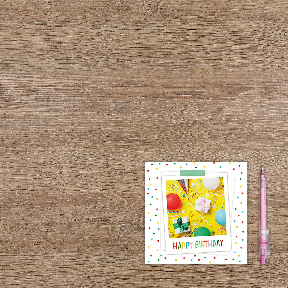 De wenskaart heeft een afmeting van x en een vierkante vorm. Op deze wenskaart staat confetti met ballonnen, cadeaus en slingers met de tekst: "Happy birthday". De binnenzijde van de wenskaart is blanco wat voldoende ruimte geeft om een persoonlijke boodschap te schrijven .