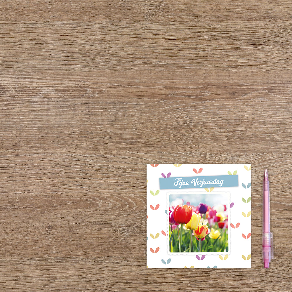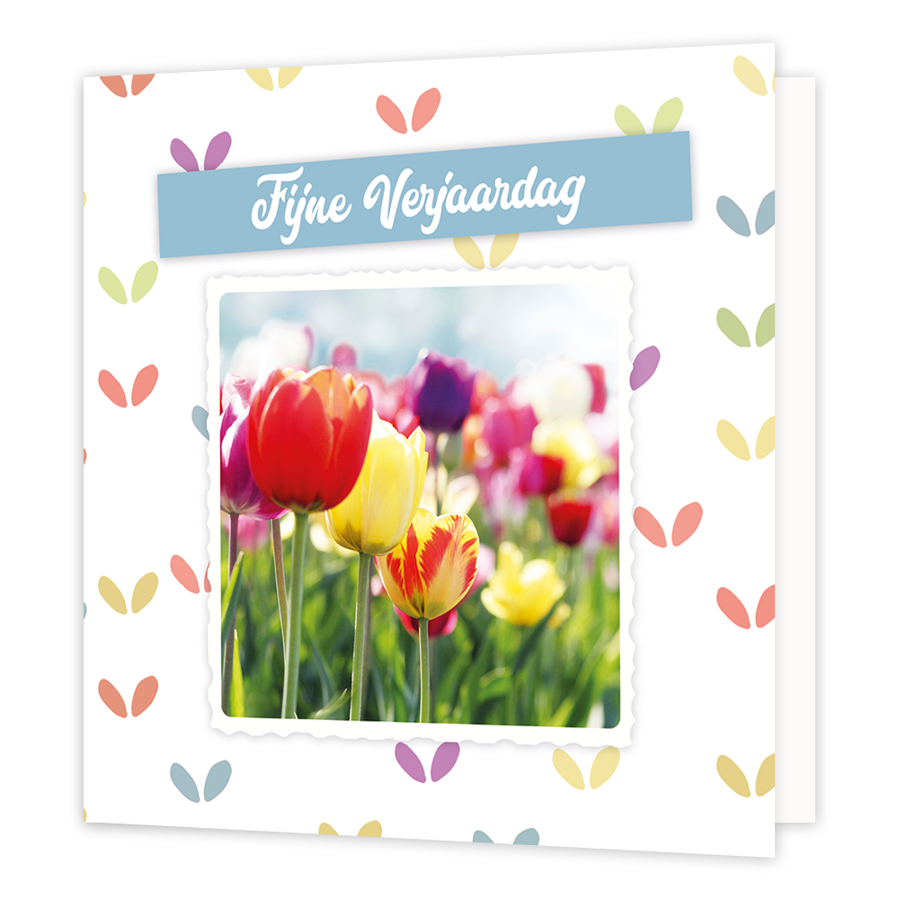 De wenskaart heeft een afmeting van x en een vierkante vorm. Op deze wenskaart staan tulpen in diverse kleuren met de tekst: "Fijne verjaardag". De binnenzijde van de wenskaart is blanco wat voldoende ruimte geeft om een persoonlijke boodschap te schrijven .