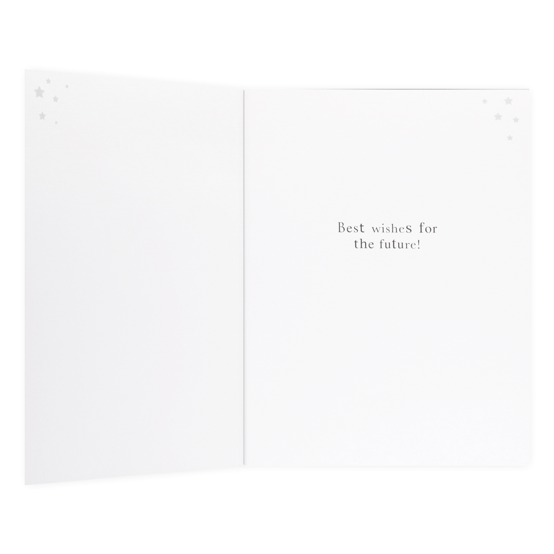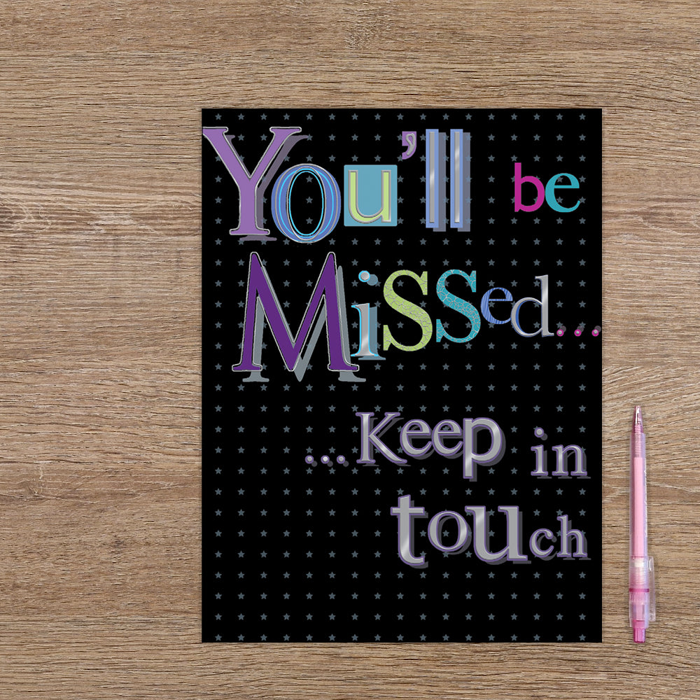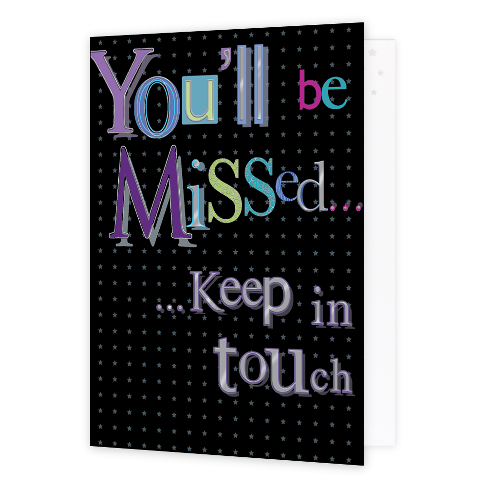De wenskaart heeft een afmeting van x en een staande vorm. Op deze wenskaart staat de tekst: "You'll be missed... keep in touch". De binnenzijde van de wenskaart is bedrukt met de tekst "Best wishes for the future".