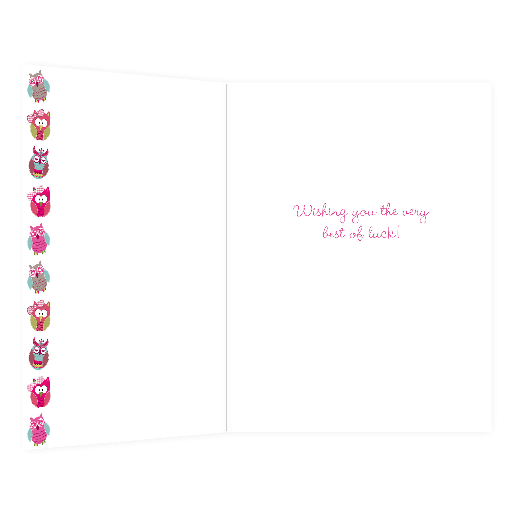 De wenskaart heeft een afmeting van x en een staande vorm. Op deze wenskaart staan uiltjes die op een takje zitten met de tekst: "Goodbye & good luck". De binnenzijde van de wenskaart is bedrukt met een ontwerp passend bij de voorzijde van de kaart en de tekst "Wishing you the very best of luck!".