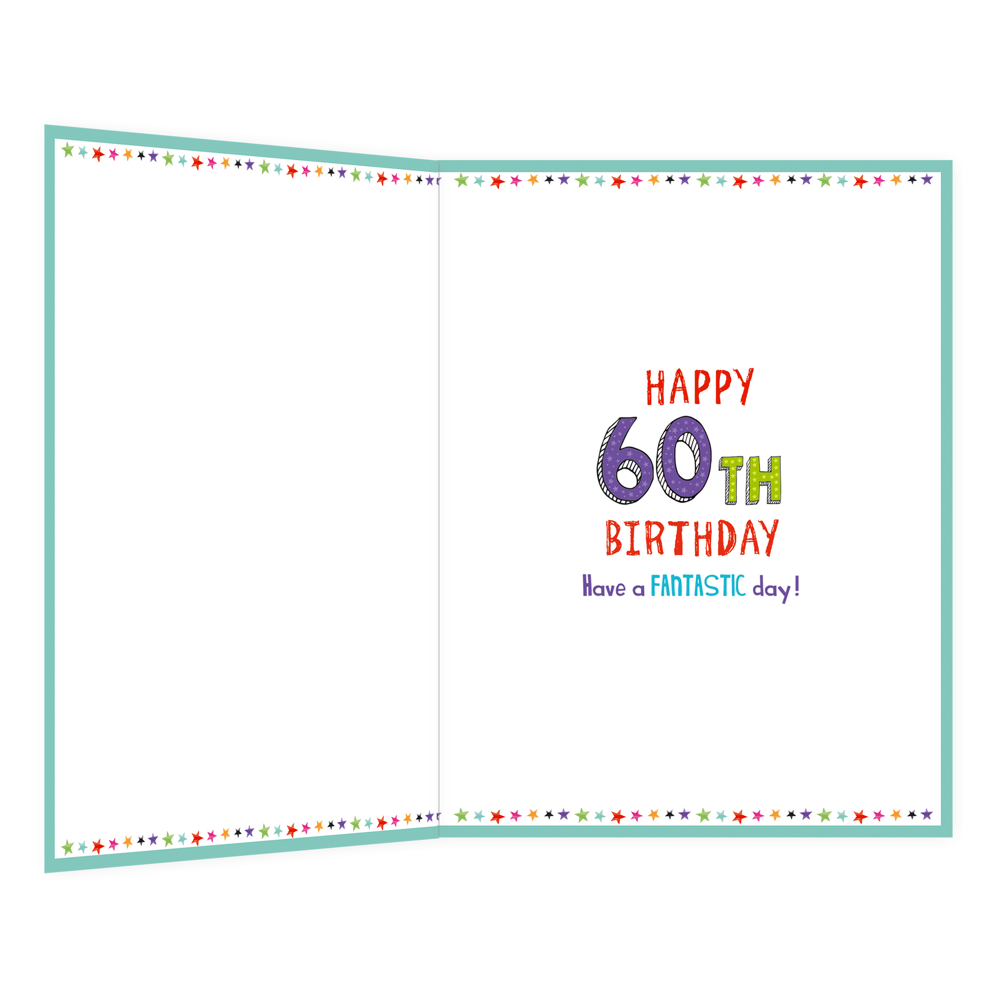 De wenskaart heeft een afmeting van x en een staande vorm. Op deze wenskaart staan teksten als: "60 today", "Happy birthday" en "Celebrate". De binnenzijde van de wenskaart is bedrukt met een ontwerp passend bij de voorzijde van de kaart en de tekst "Happy 60th birthday".
