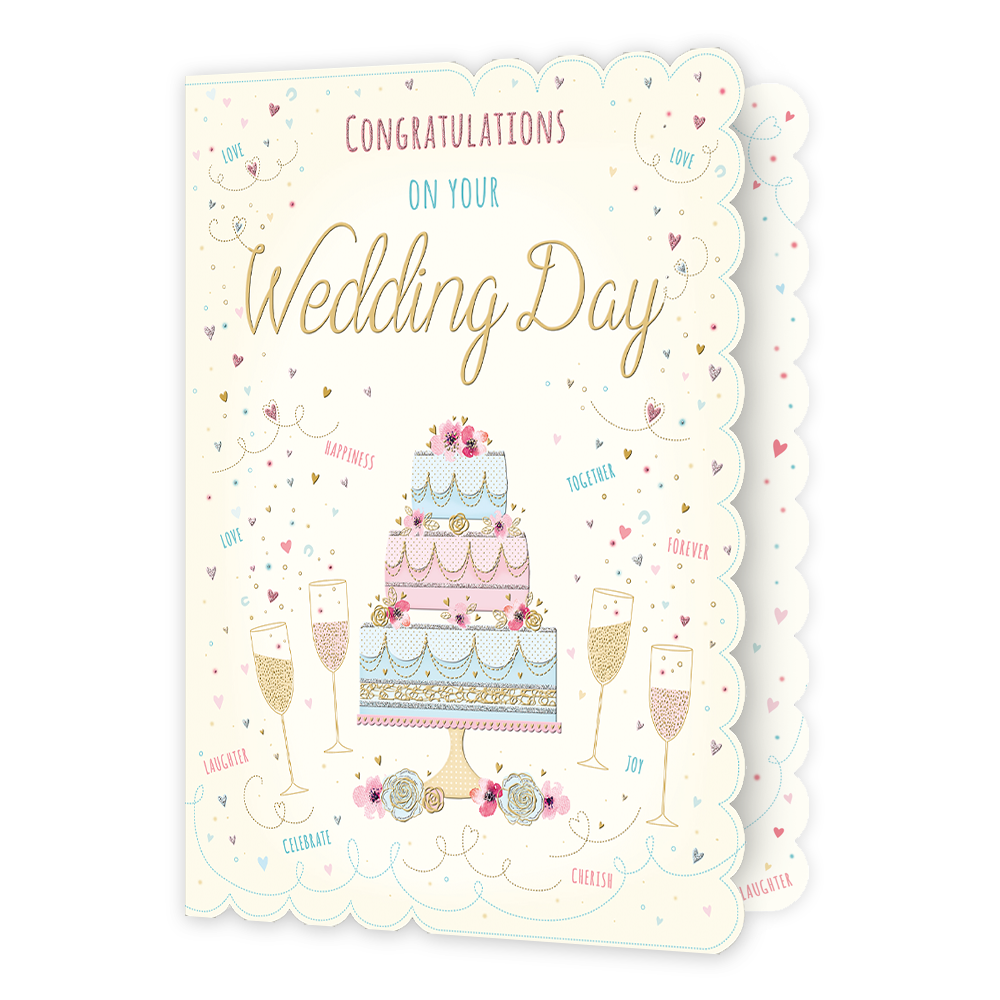 De wenskaart heeft een afmeting van x en een staande vorm. Op deze wenskaart staat een grote drielaagse taart omringt door hartjes en champagneglazen. Boven de taart staat de tekst: "Congratualtions on your wedding day". De binnenzijde van de wenskaart is bedrukt met een ontwerp passend bij de voorzijde van de kaart en de tekst "Wishing you a future full of love & happiness".
