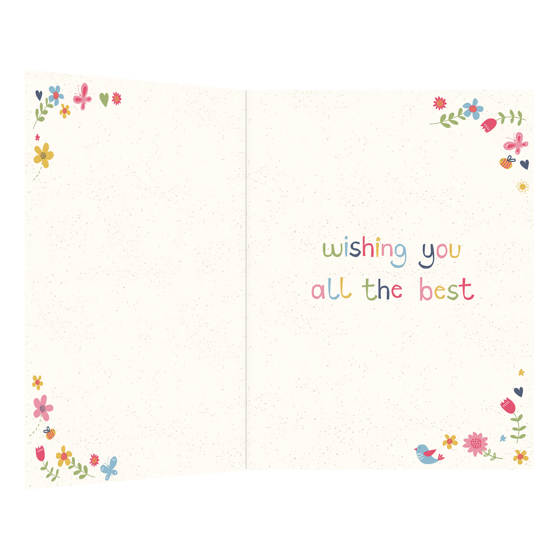 De wenskaart heeft een afmeting van x en een staande vorm. Op deze wenskaart staat de tekst: "Sorry you're leaving we will miss you lots & lots". De binnenzijde van de wenskaart is bedrukt met een ontwerp passend bij de voorzijde van de kaart en de tekst "Wishing you all the best".