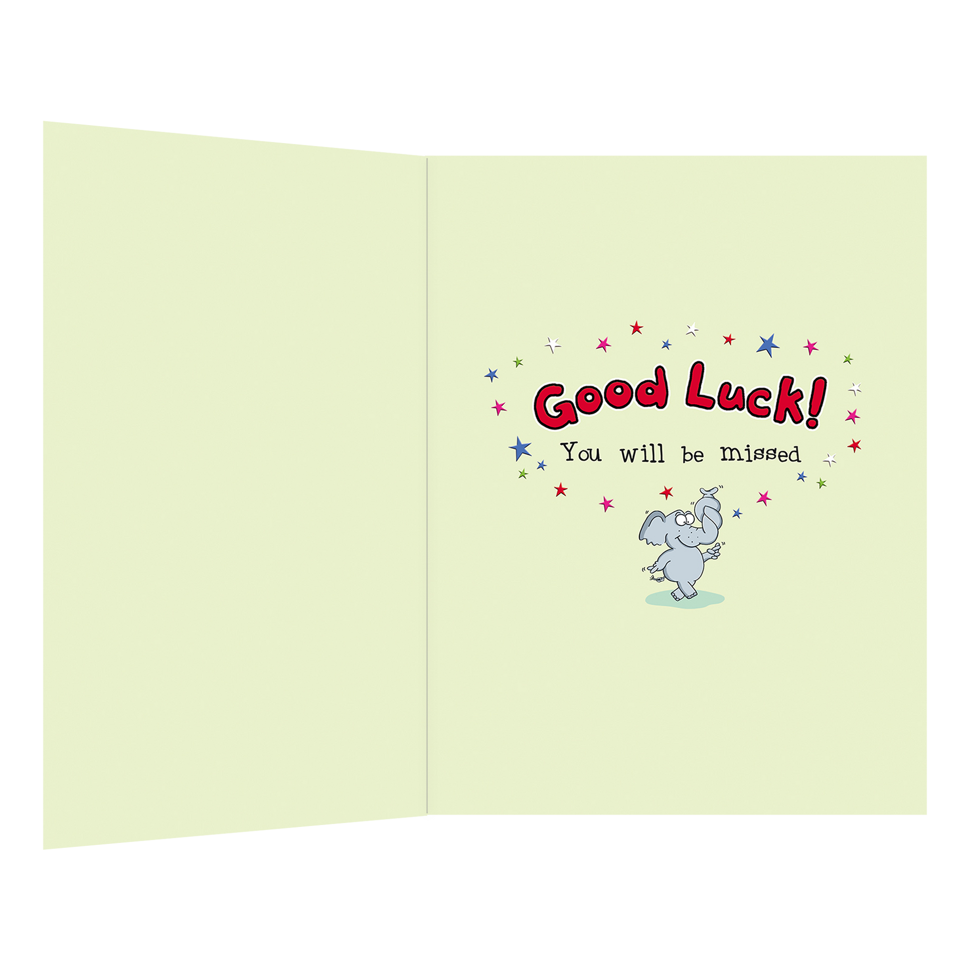 De wenskaart heeft een afmeting van x en een staande vorm. Op deze wenskaart staat een olifant met daarboven de tekst: "Goodbye & good luck! Got everything crossed for you". De binnenzijde van de wenskaart is bedrukt met een ontwerp passend bij de voorzijde van de kaart en de tekst "Good luck! You will be missed".