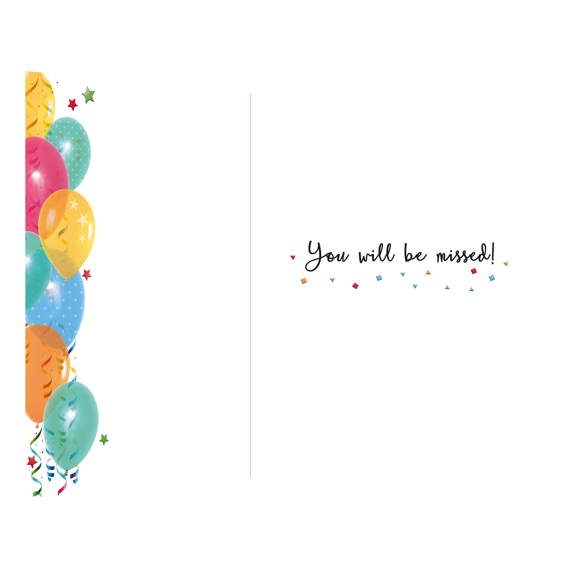 De wenskaart heeft een afmeting van x en een staande vorm. Op deze wenskaart staan ballonnen in de kleuren groen, roze, geel oranje en blauw met daarnaast de tekst: "Sorry you're leaving!" De binnenzijde van de wenskaart is bedrukt met een ontwerp passend bij de voorzijde van de kaart en de tekst "You will be missed".